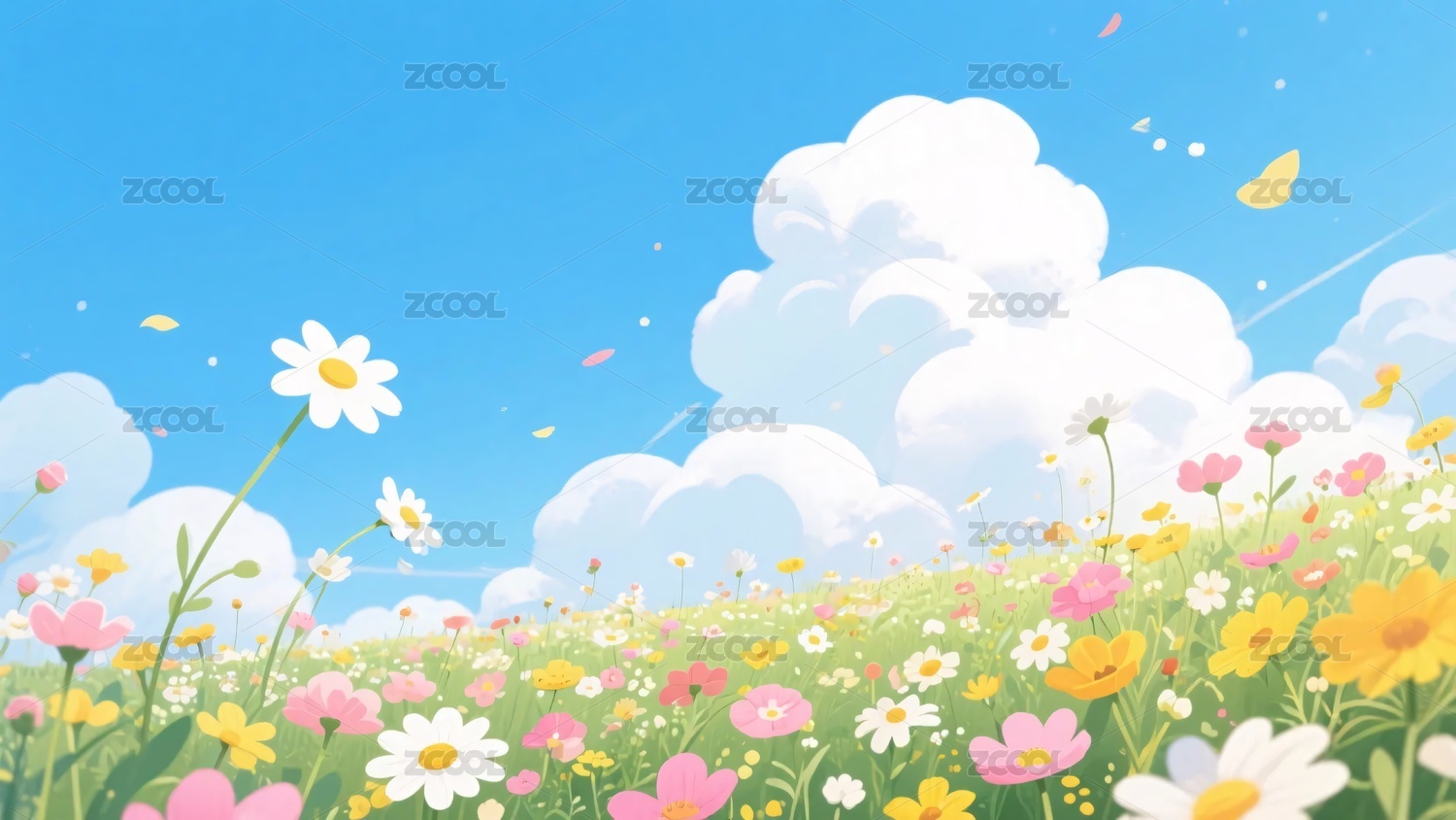 田野,黄花,蓝天,白云,飞鸟,插画,风景,自然,户外,清新