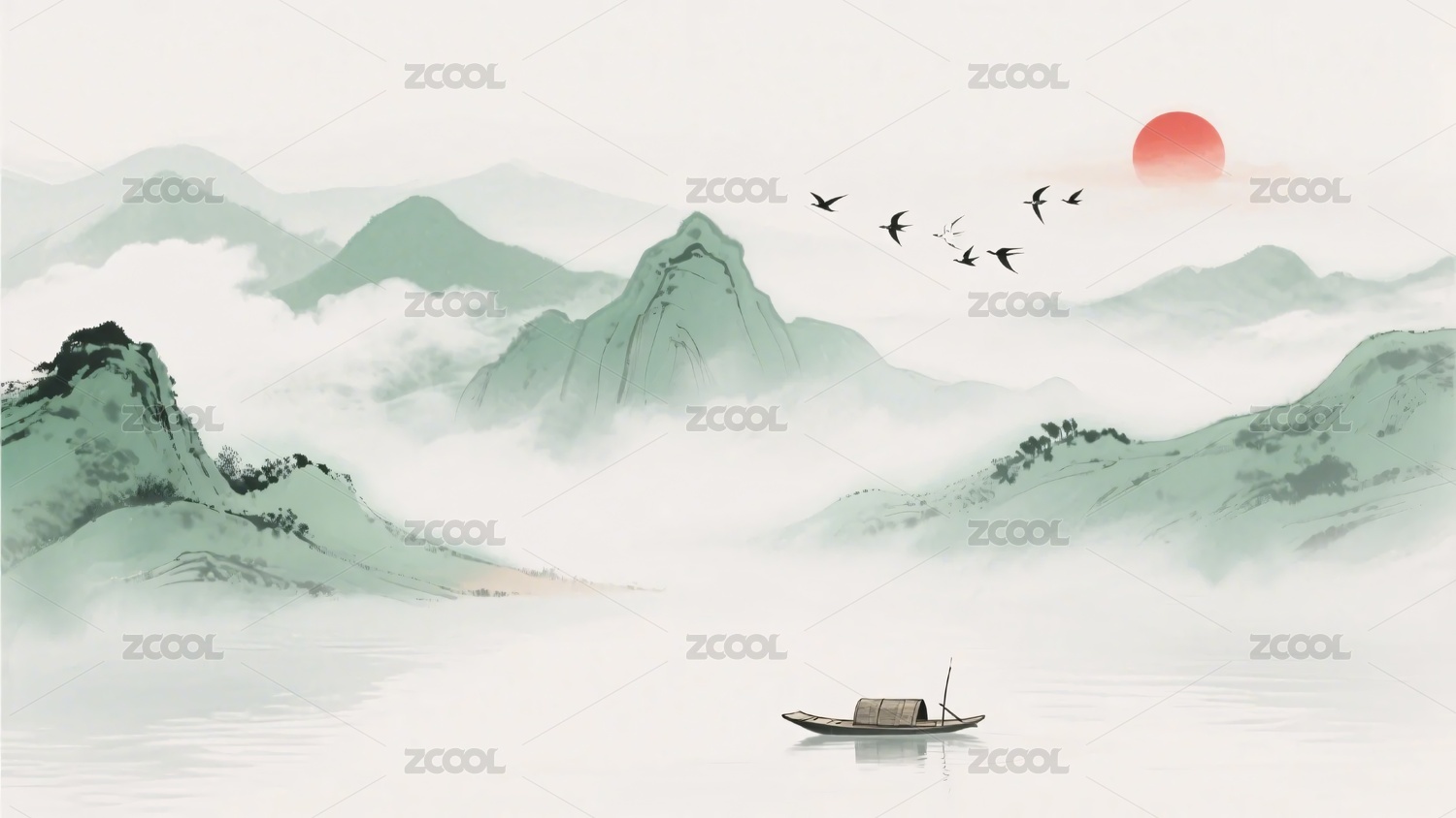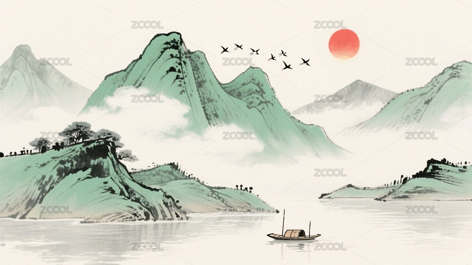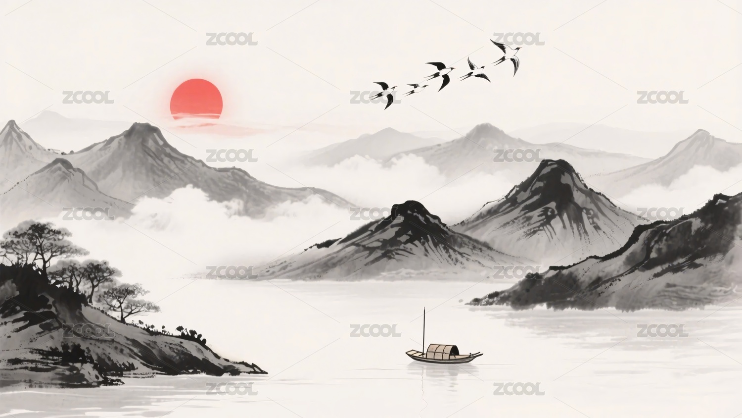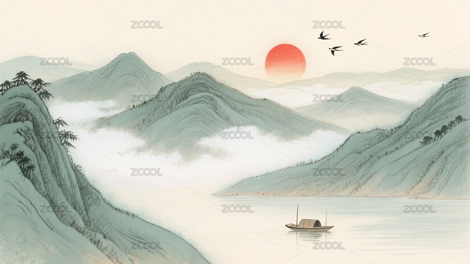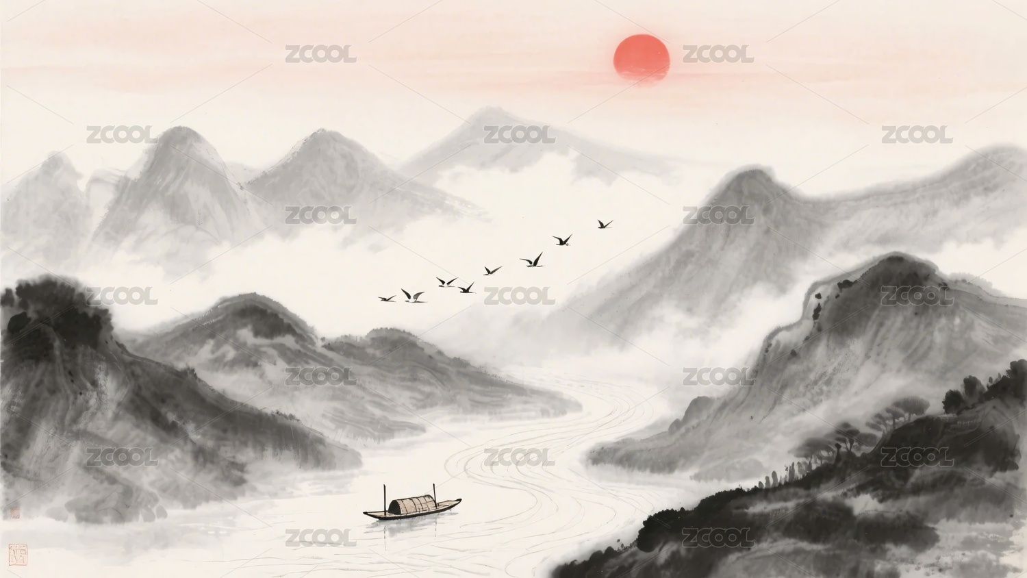 山水,落日,飞鸟,小船,插画,风景,自然,意境,水墨画,中式