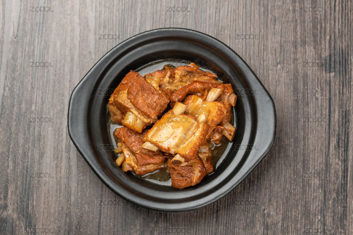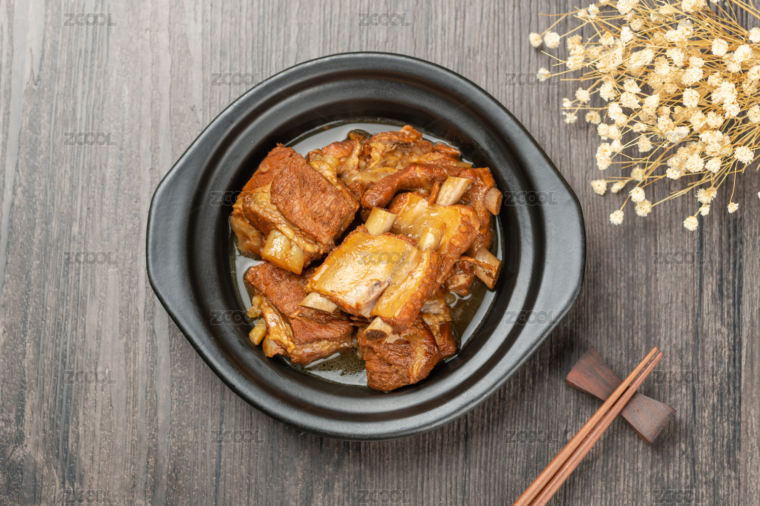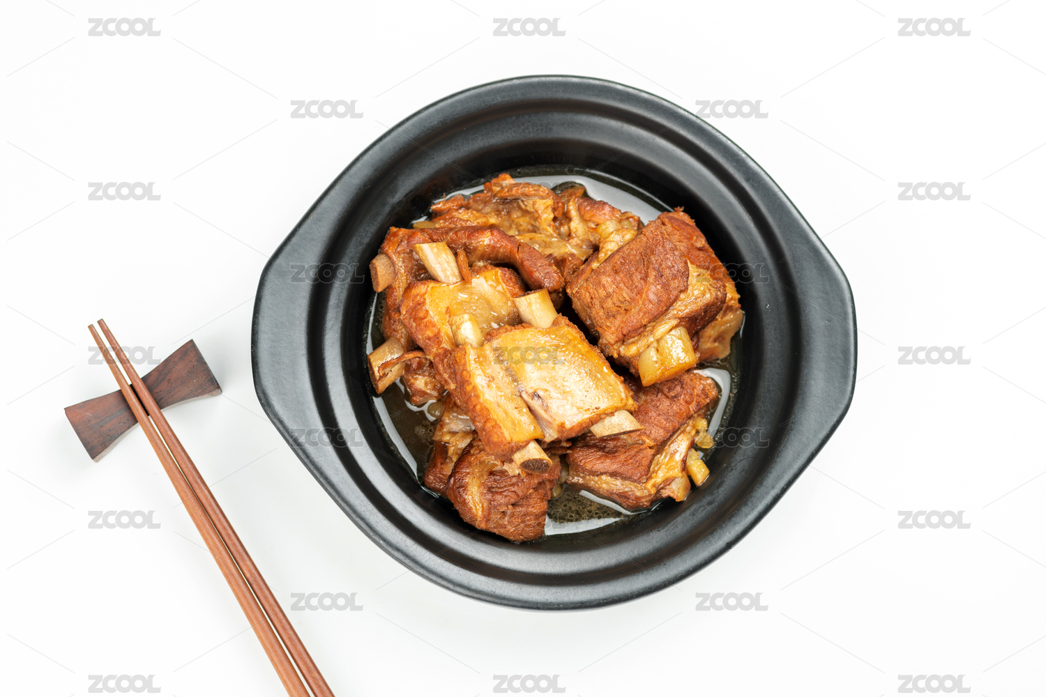 用筷子从砂锅中夹起红烧牛窝骨特写深色调