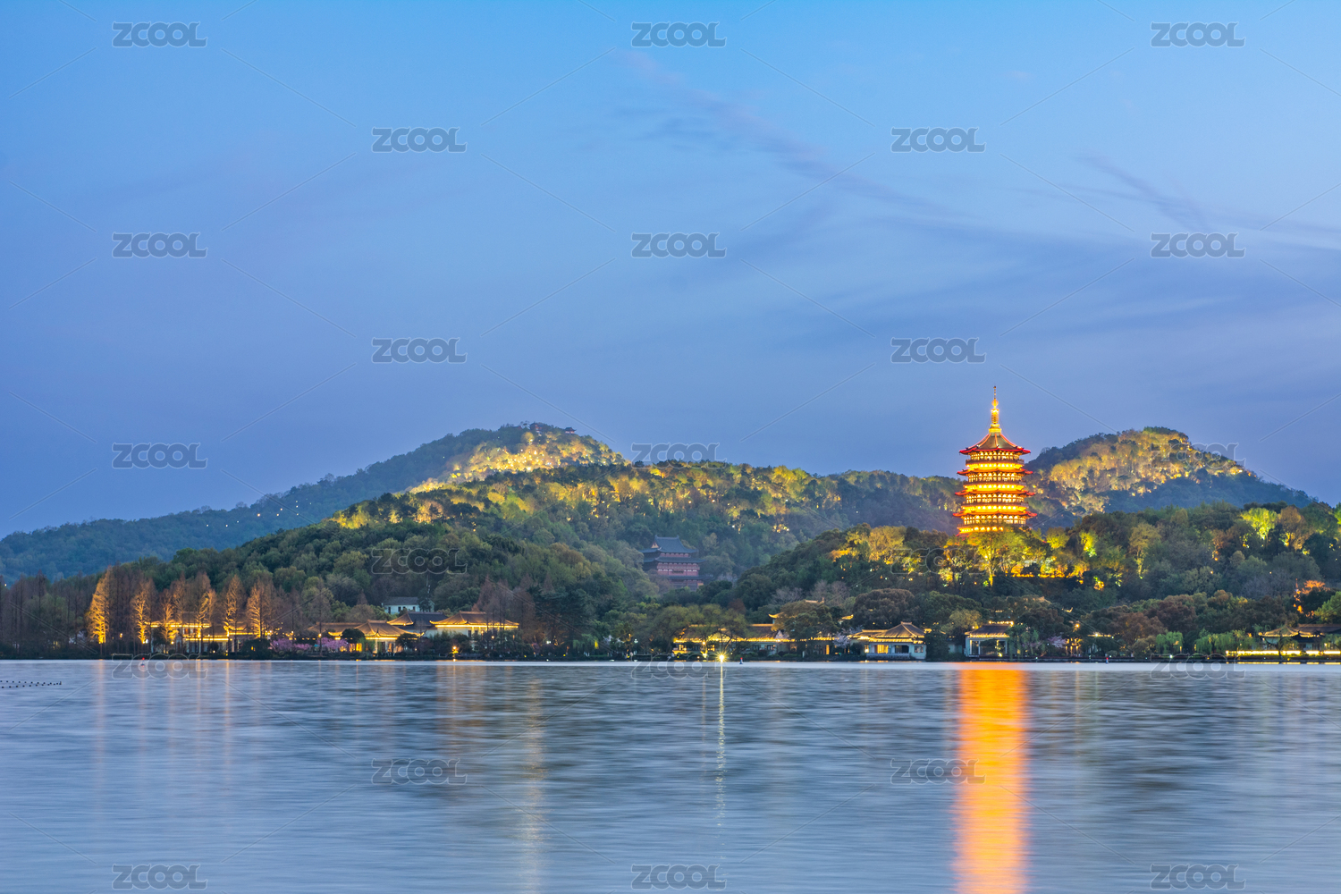 中国浙江杭州西湖雷峰塔夜景城市风光