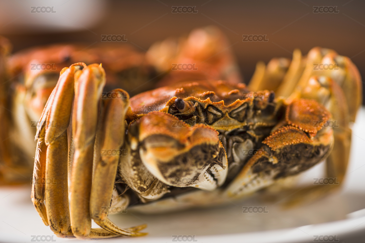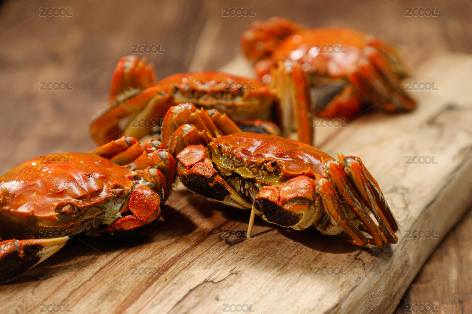 木纹背景上摆放熟的阳澄湖大闸蟹