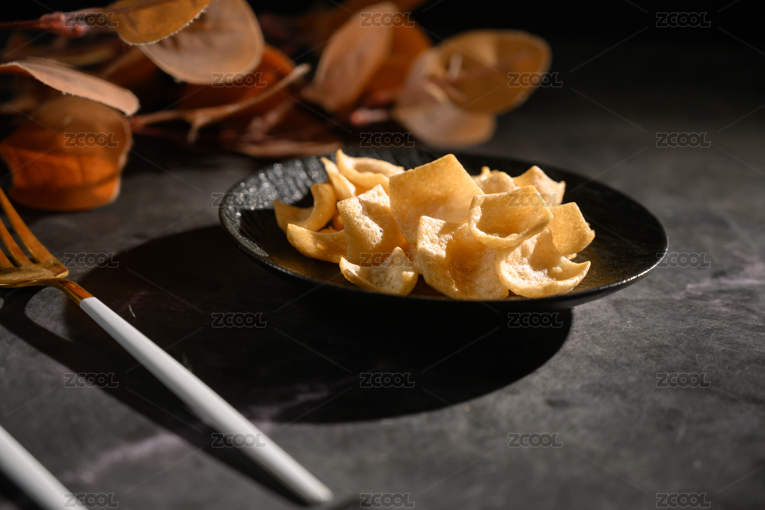 桌面上的盘子里的美味可口的虾片