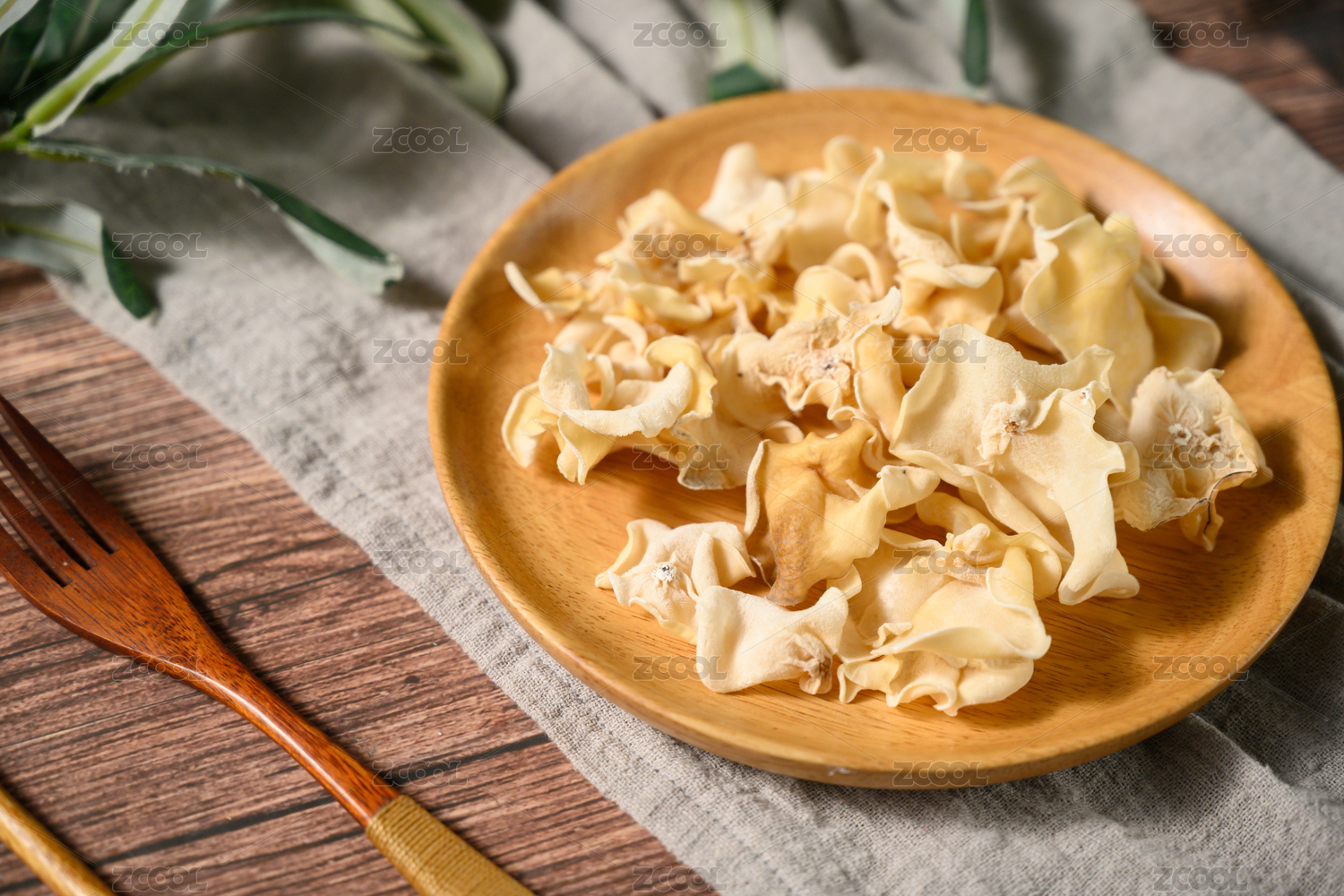 桌面上的盘子里的美味可口的干白玉木耳