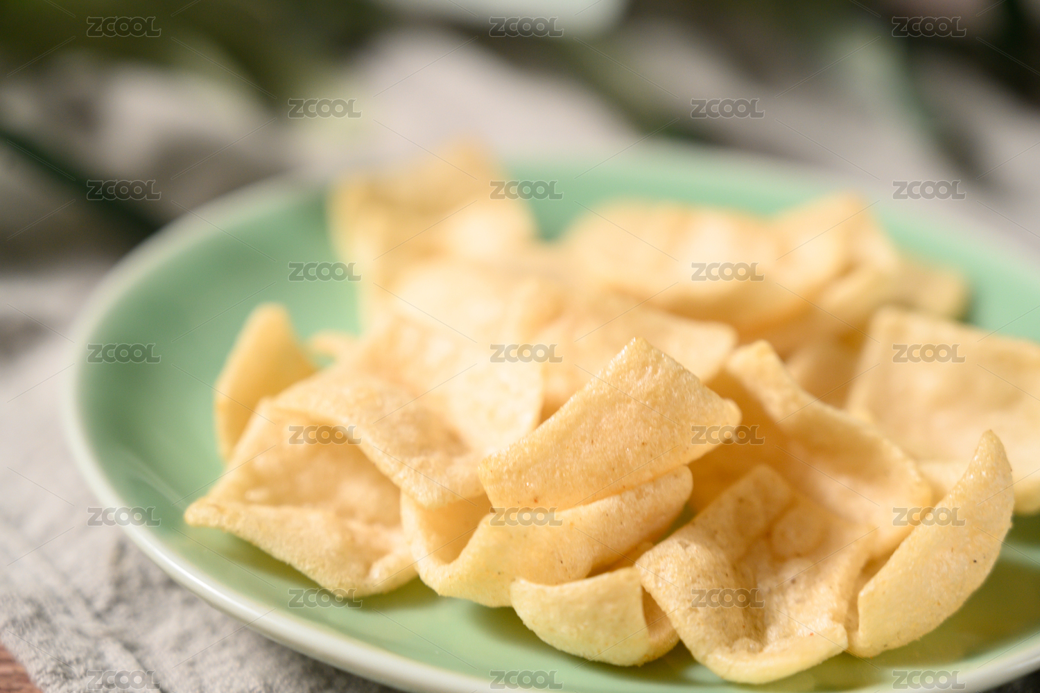 桌面上的盘子里的美味可口的虾片