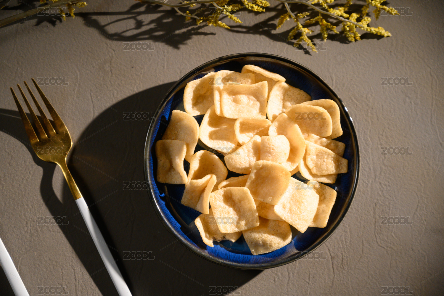 桌面上的盘子里的美味可口的虾片