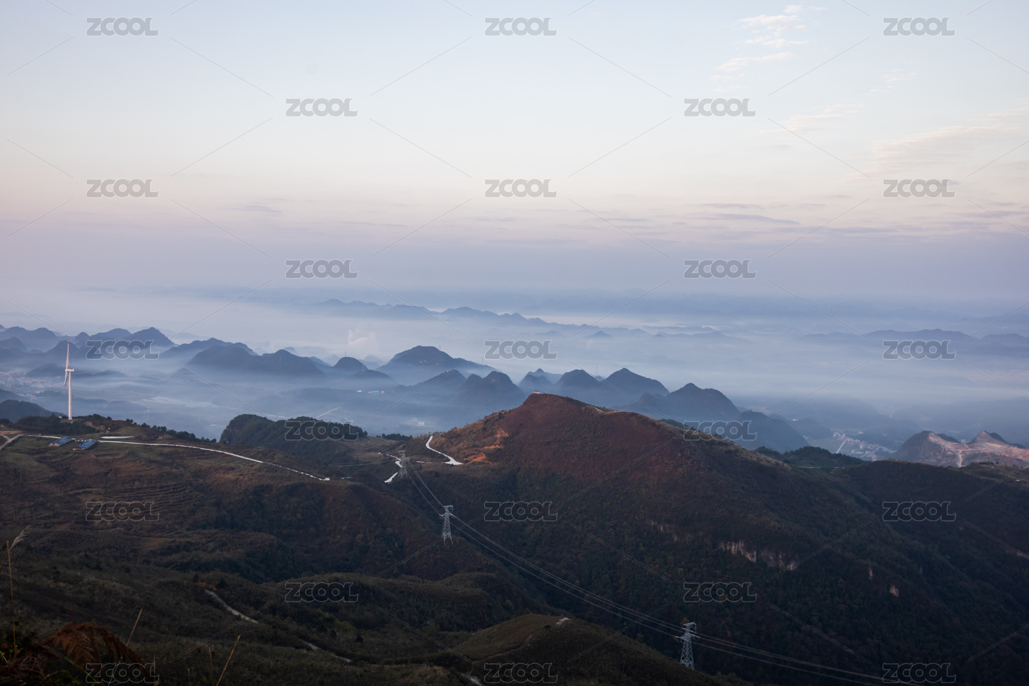 清晨中国福建省龙岩市红尖山上的风车与山峦间的云海