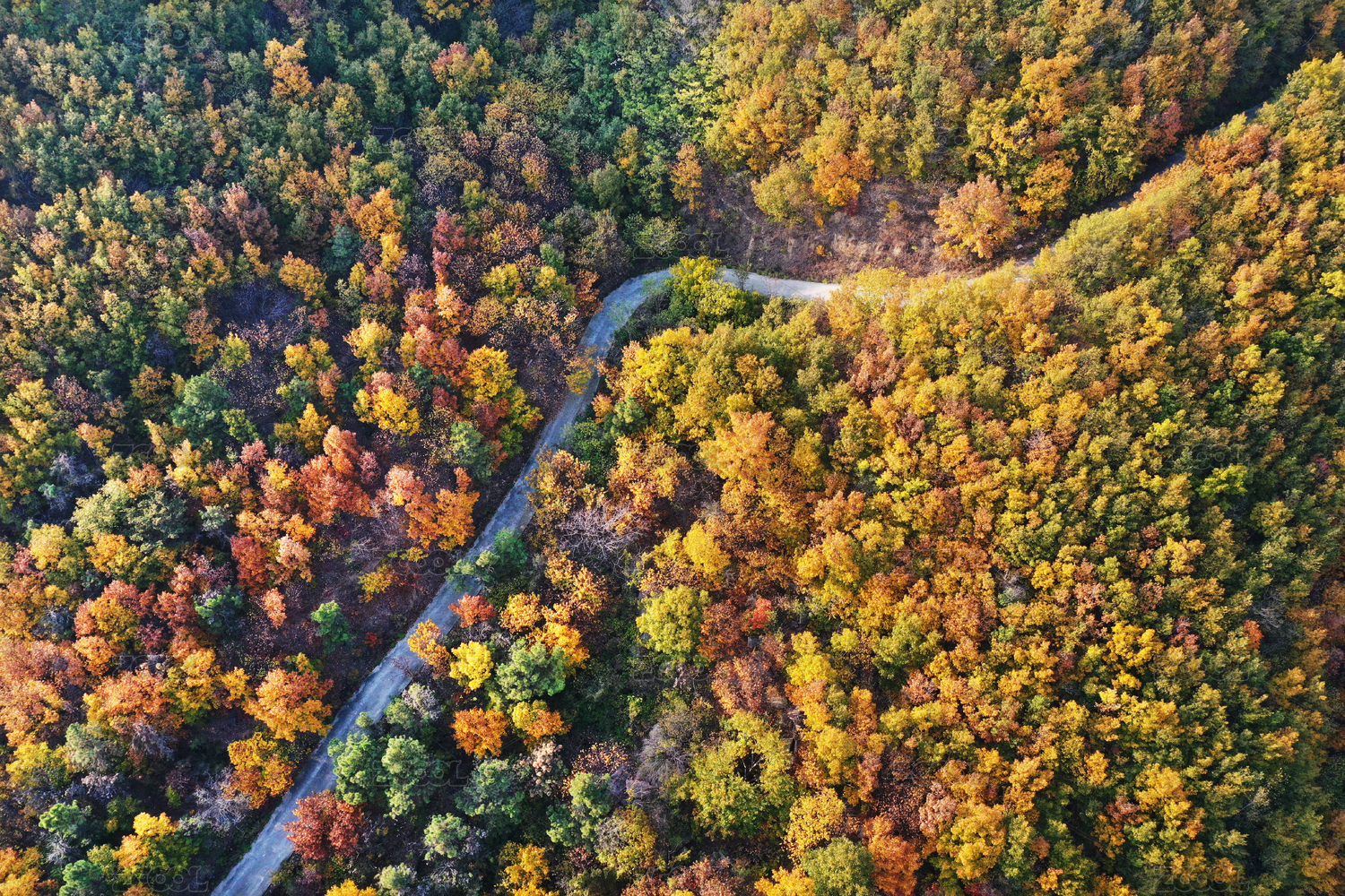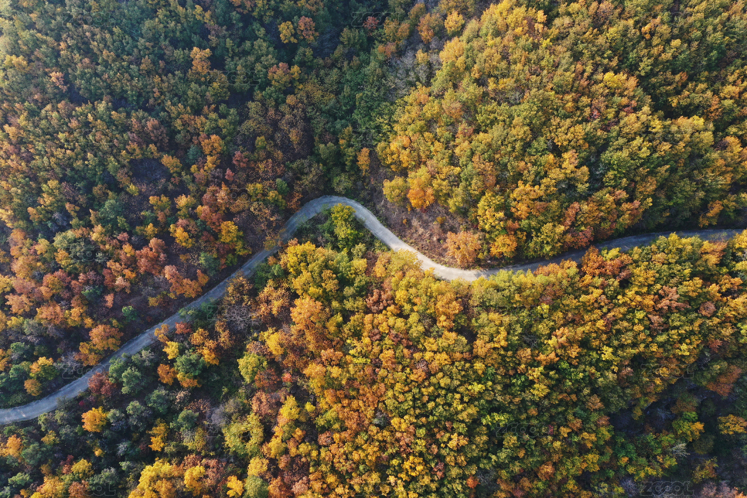 山东枣庄莲青山上一条在秋天多彩树林中穿行的盘山路