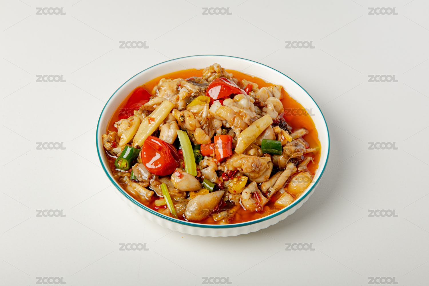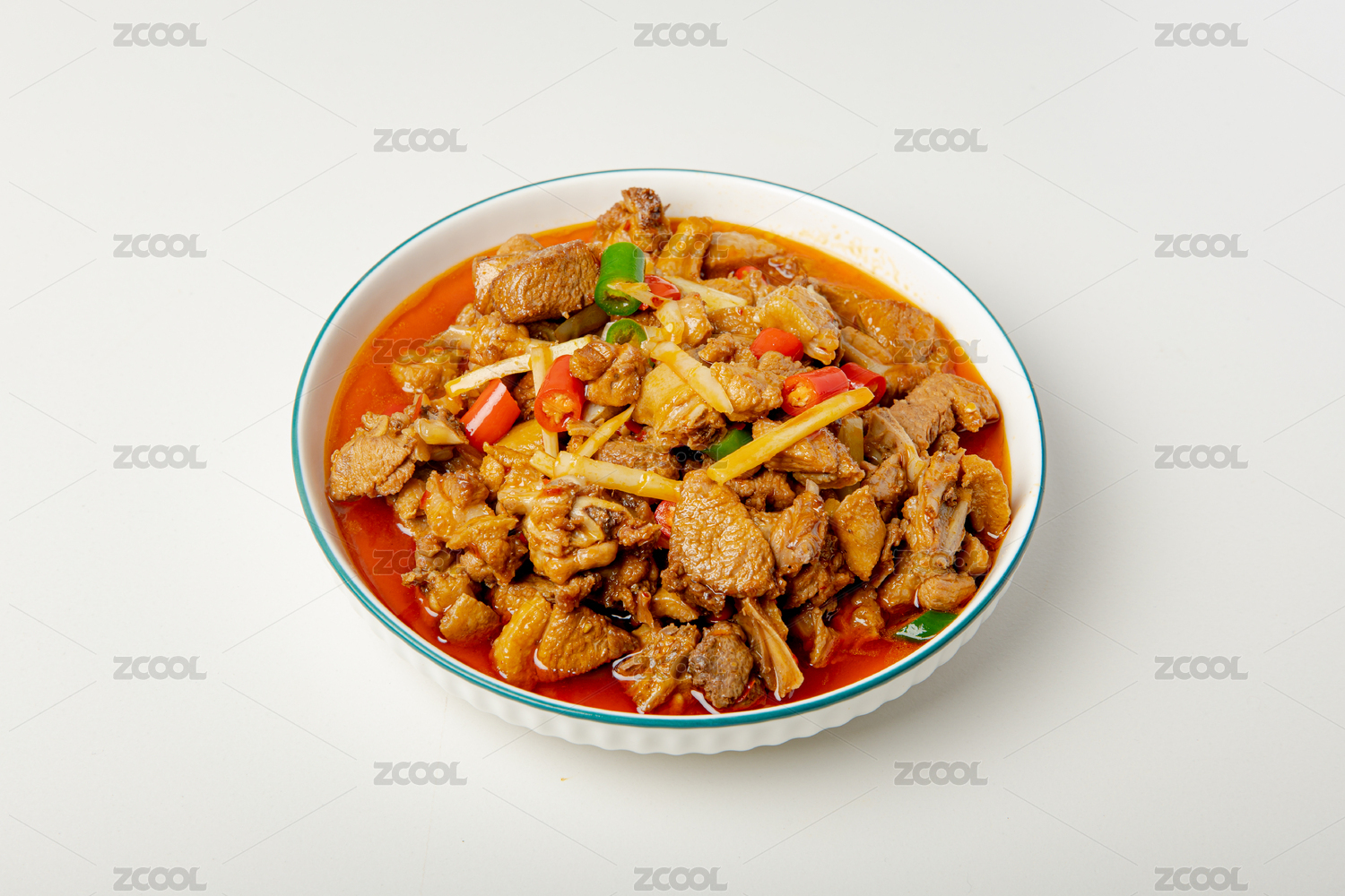 白色背景上白瓷盘中的酸菜鸡,配着一碟土豆