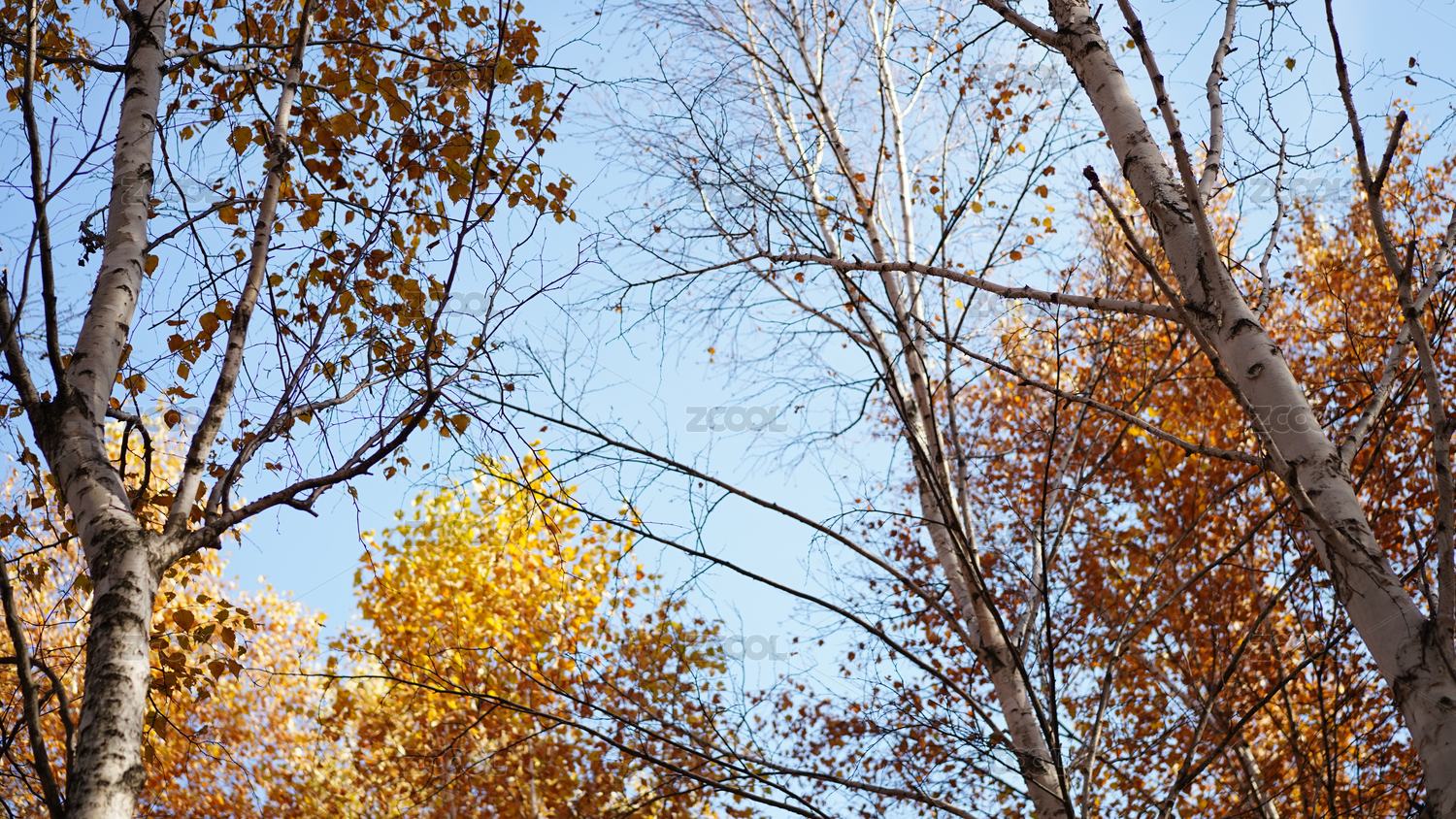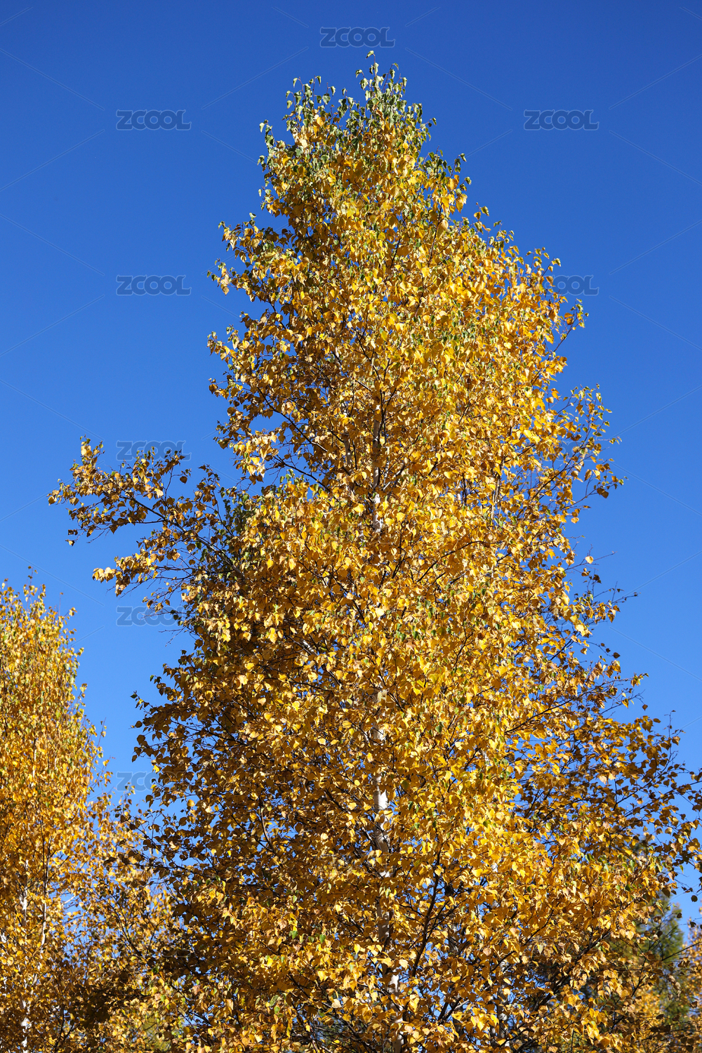 蓝天下秋天森林里金黄色树木树叶的自然风景
