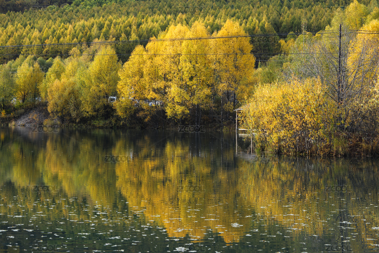 秋天金黄色的树木和湖面反射倒影的自然风景