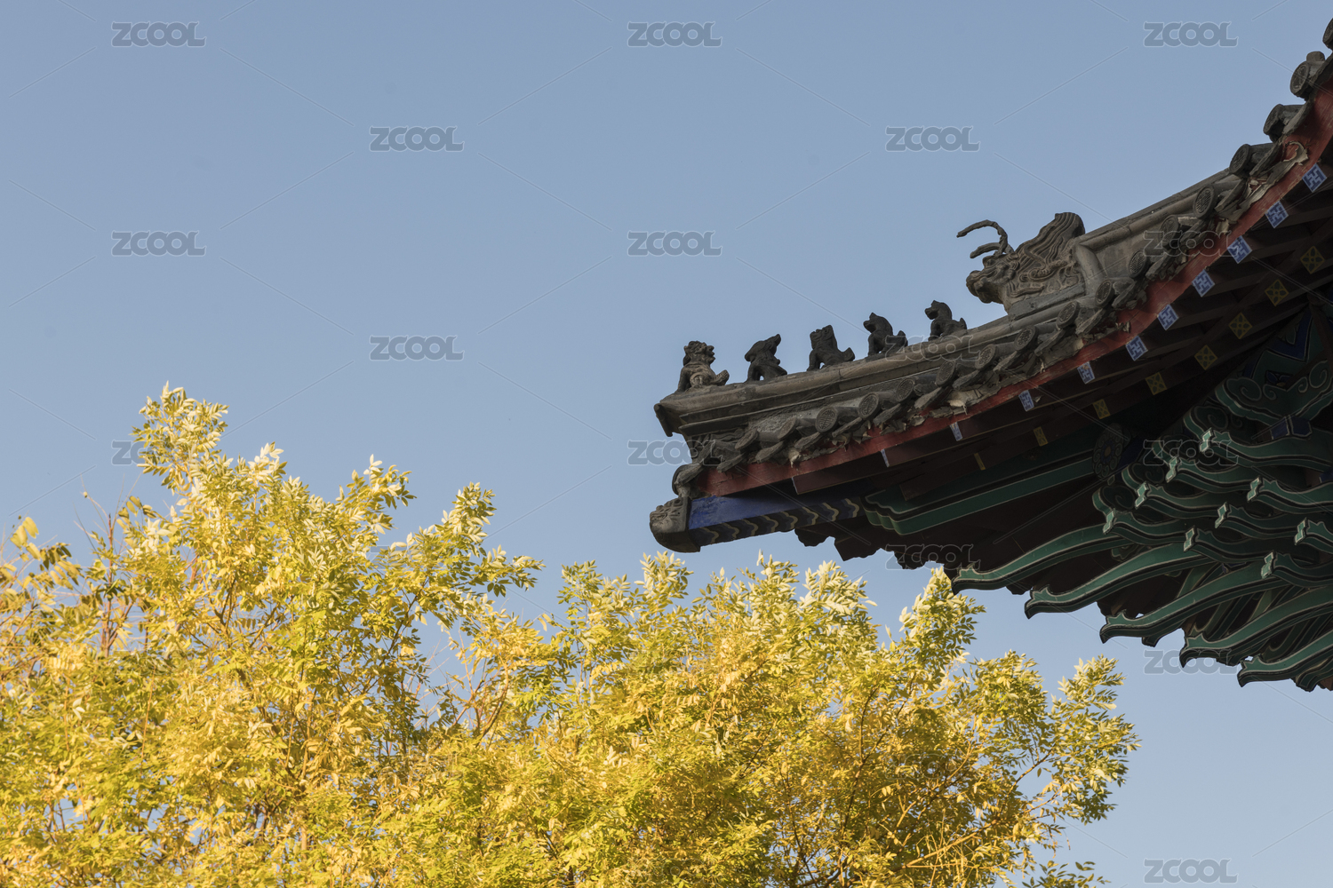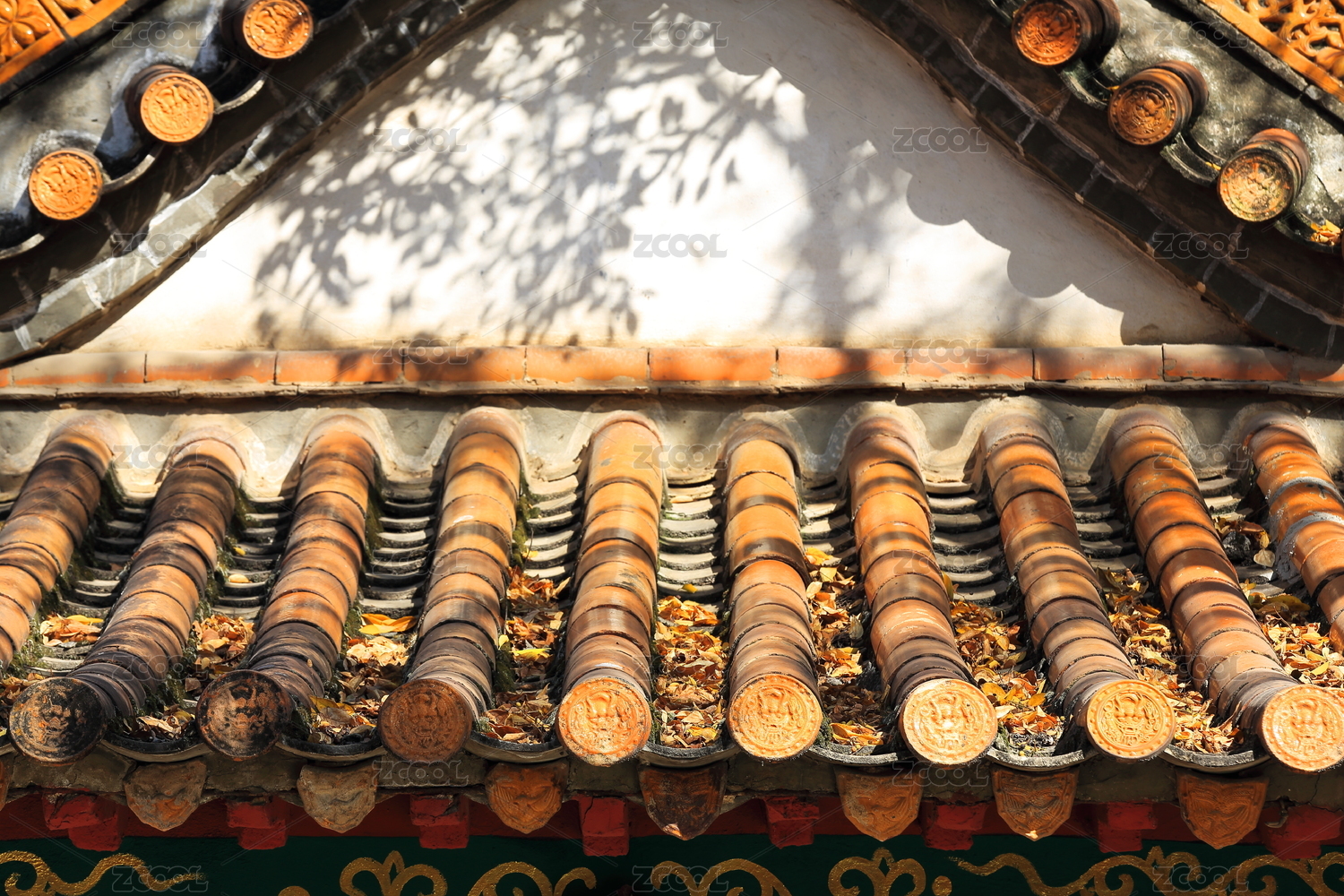 冬日温暖的阳光照在中国古典建筑的屋顶上