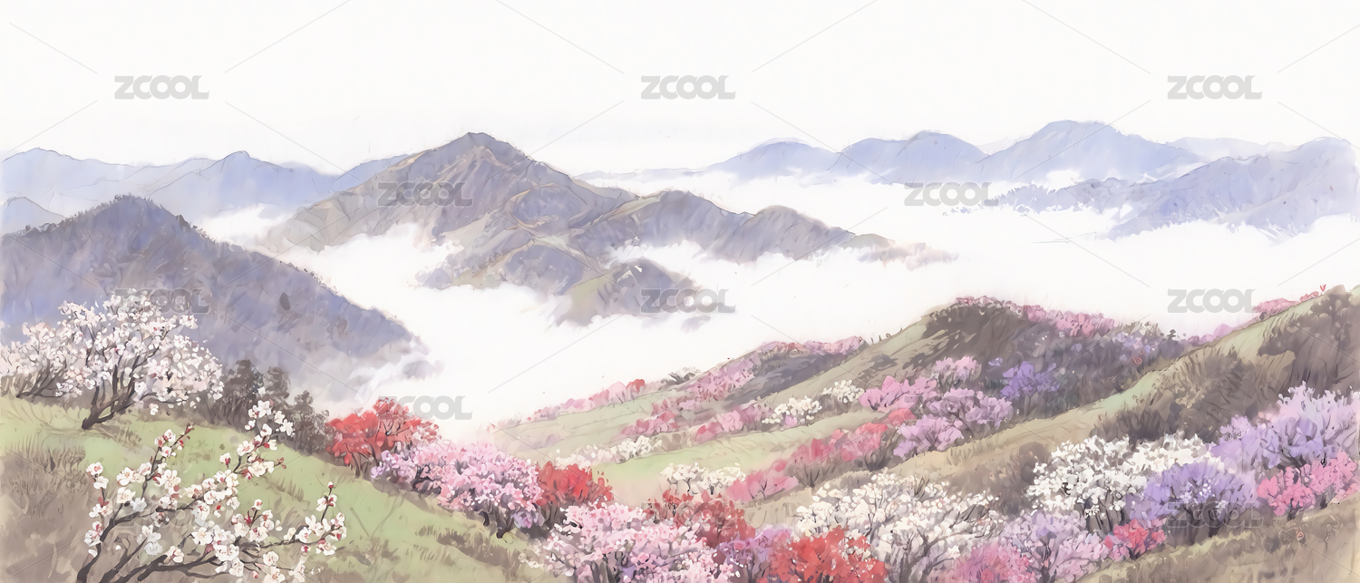 花朵,绘画,自然,树木,绿色,生机,传统,山峰,桃花,房屋