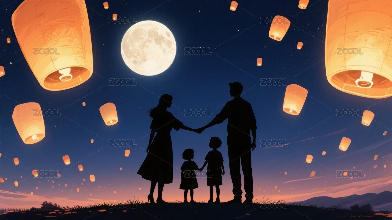 月下家庭放孔明灯场景