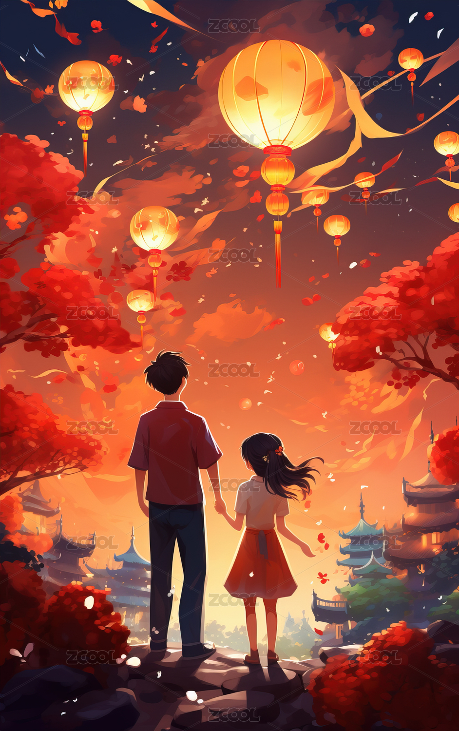 氛围,人物,水面,倒影,家庭,夜晚,月亮,孔明灯,房屋,云朵