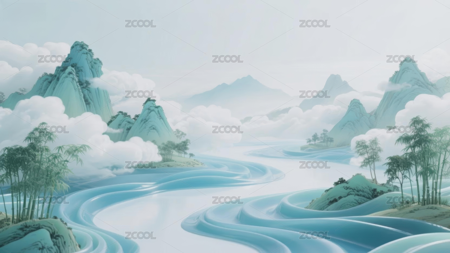青绿山水传统古风国潮背景图壁纸
