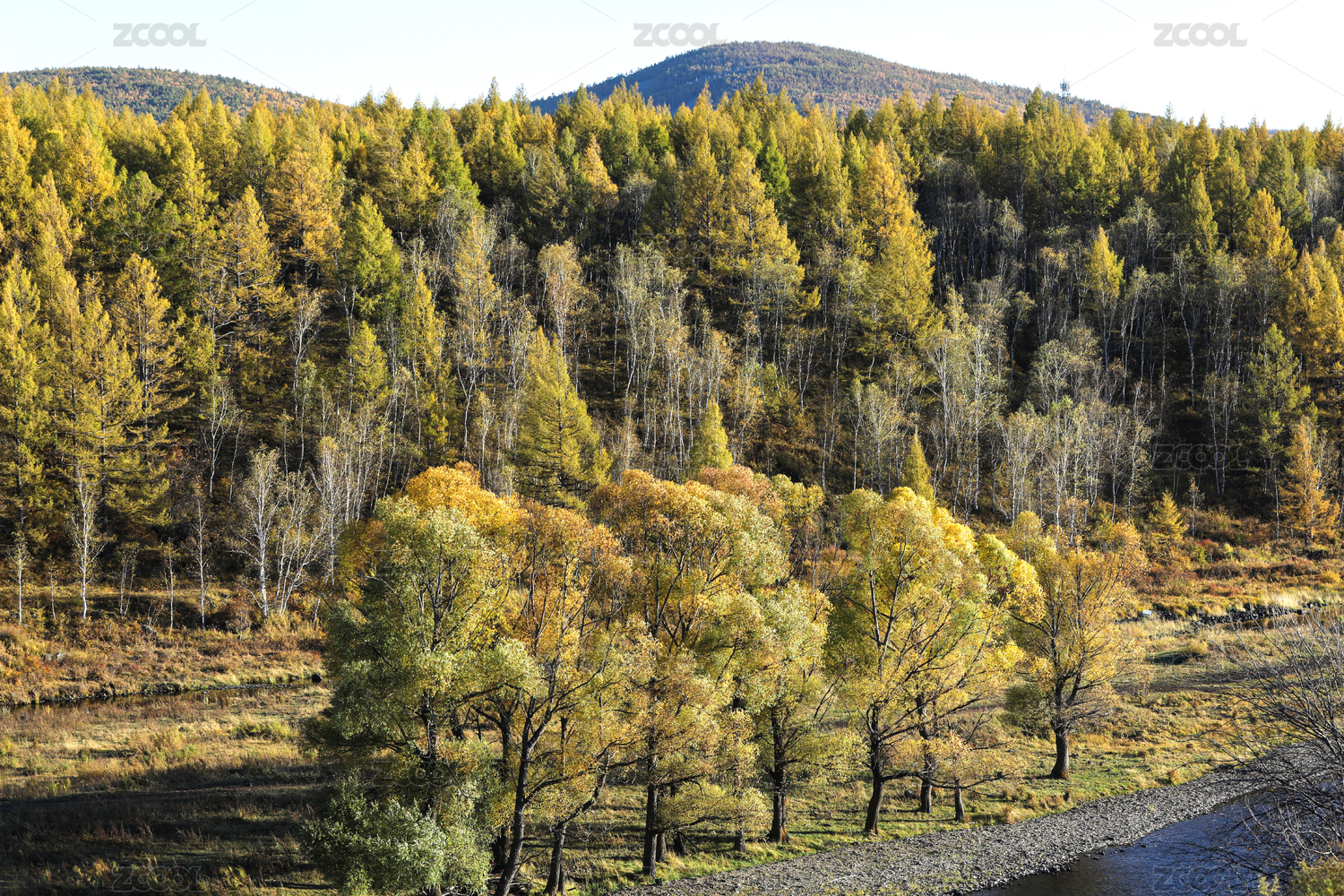 秋天内蒙古阿尔山森林里的河流和树木风景