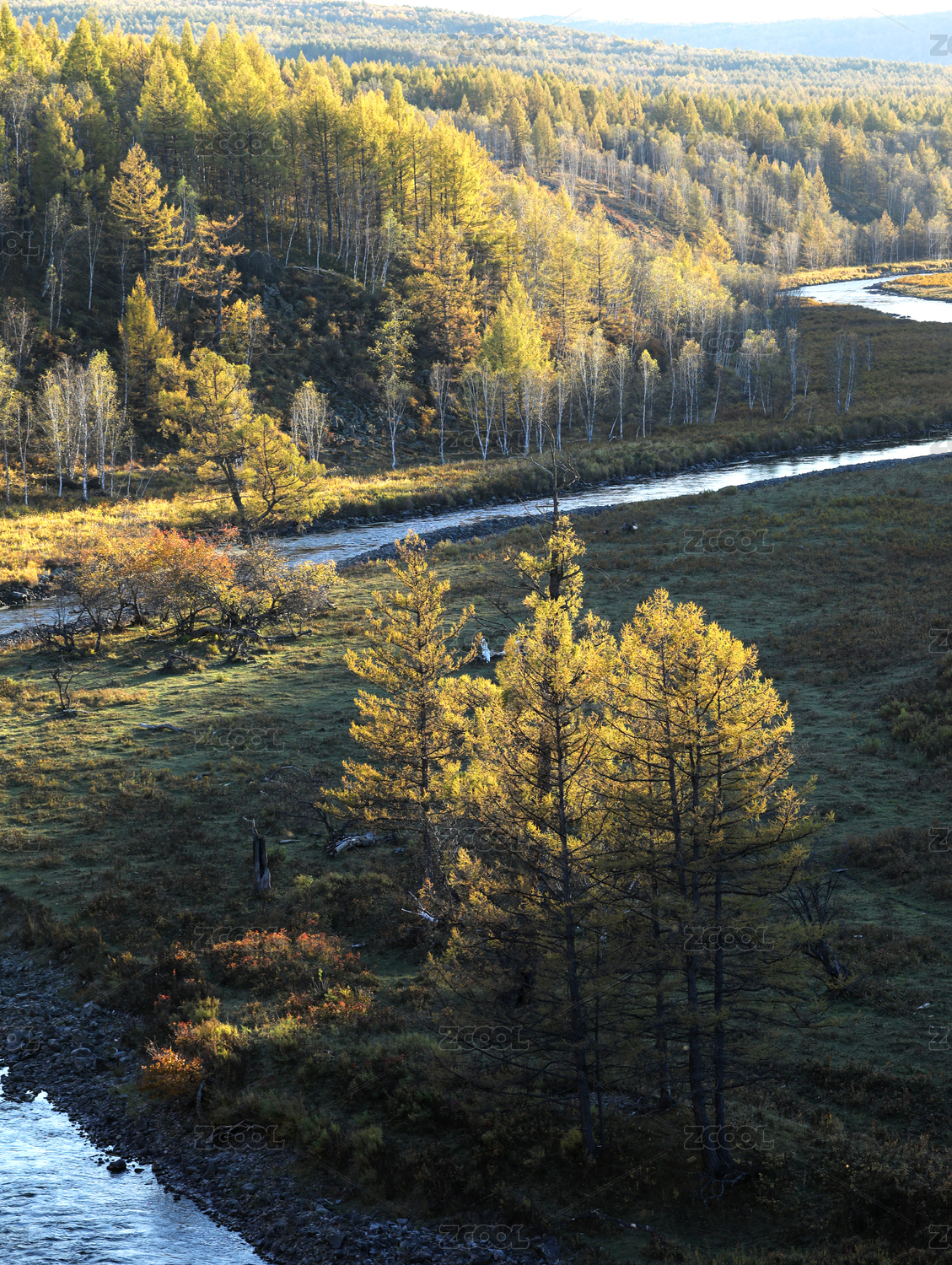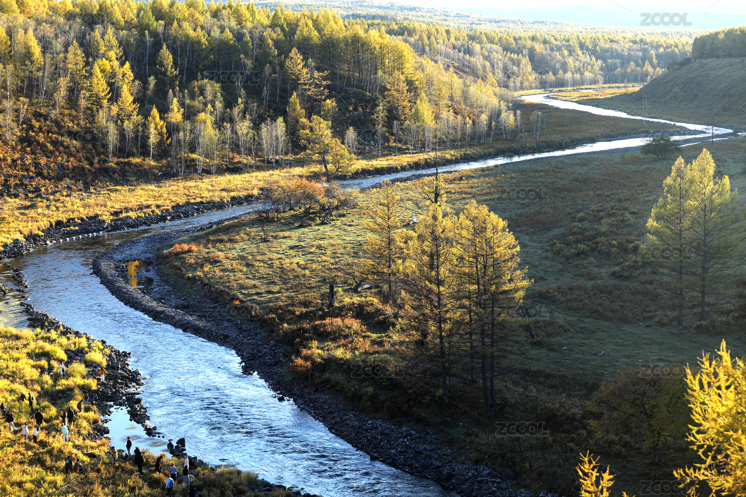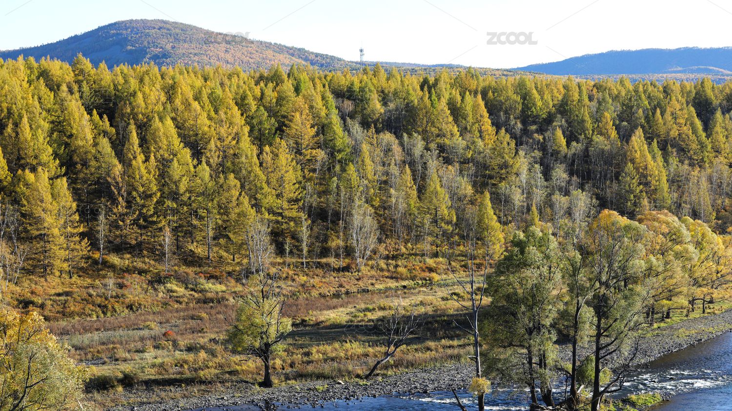 内蒙古阿尔山秋天里的河流和金黄色森林风景
