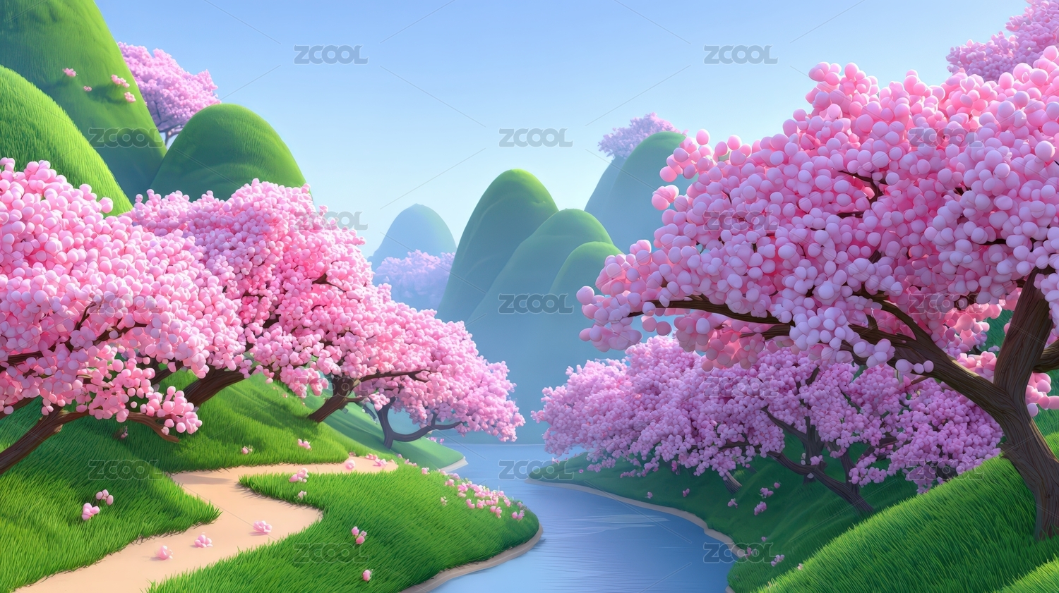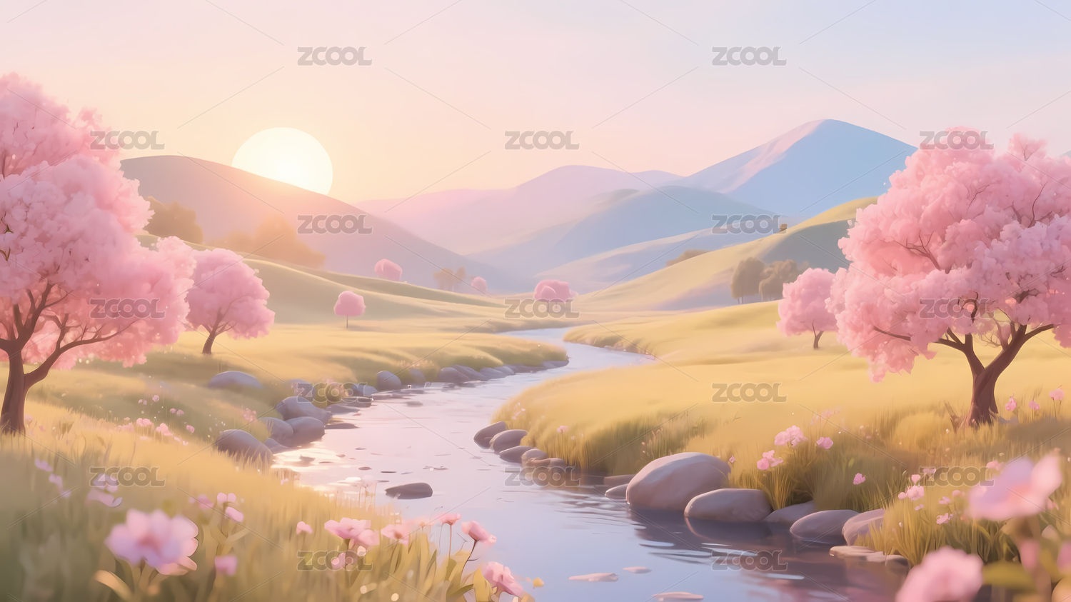 梦幻,色彩,粉色,柔和,自然,树木,天空,草地,美丽,河流