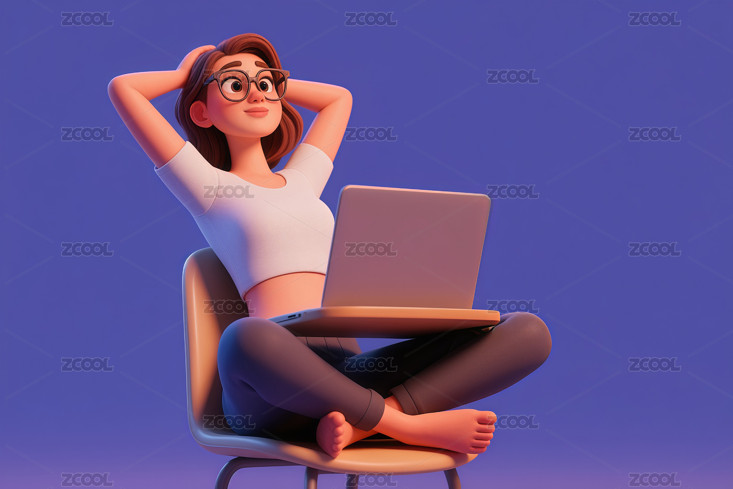 盘腿坐使用电脑双手抱头的女青年3D插画