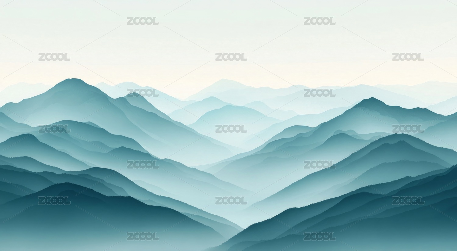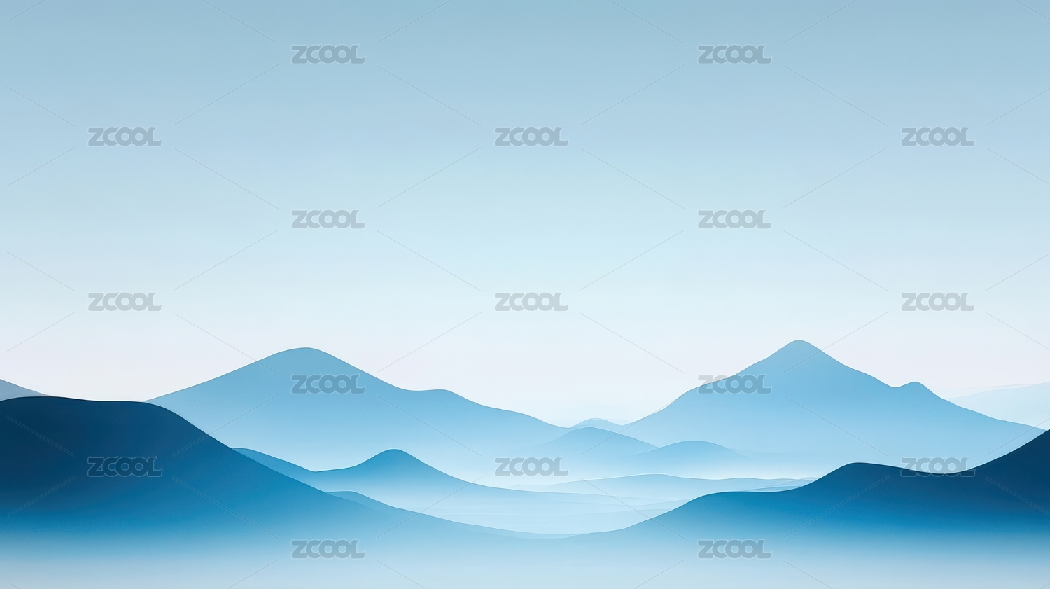 淡蓝背景下群山层叠朦胧展现诗意水墨山水意
