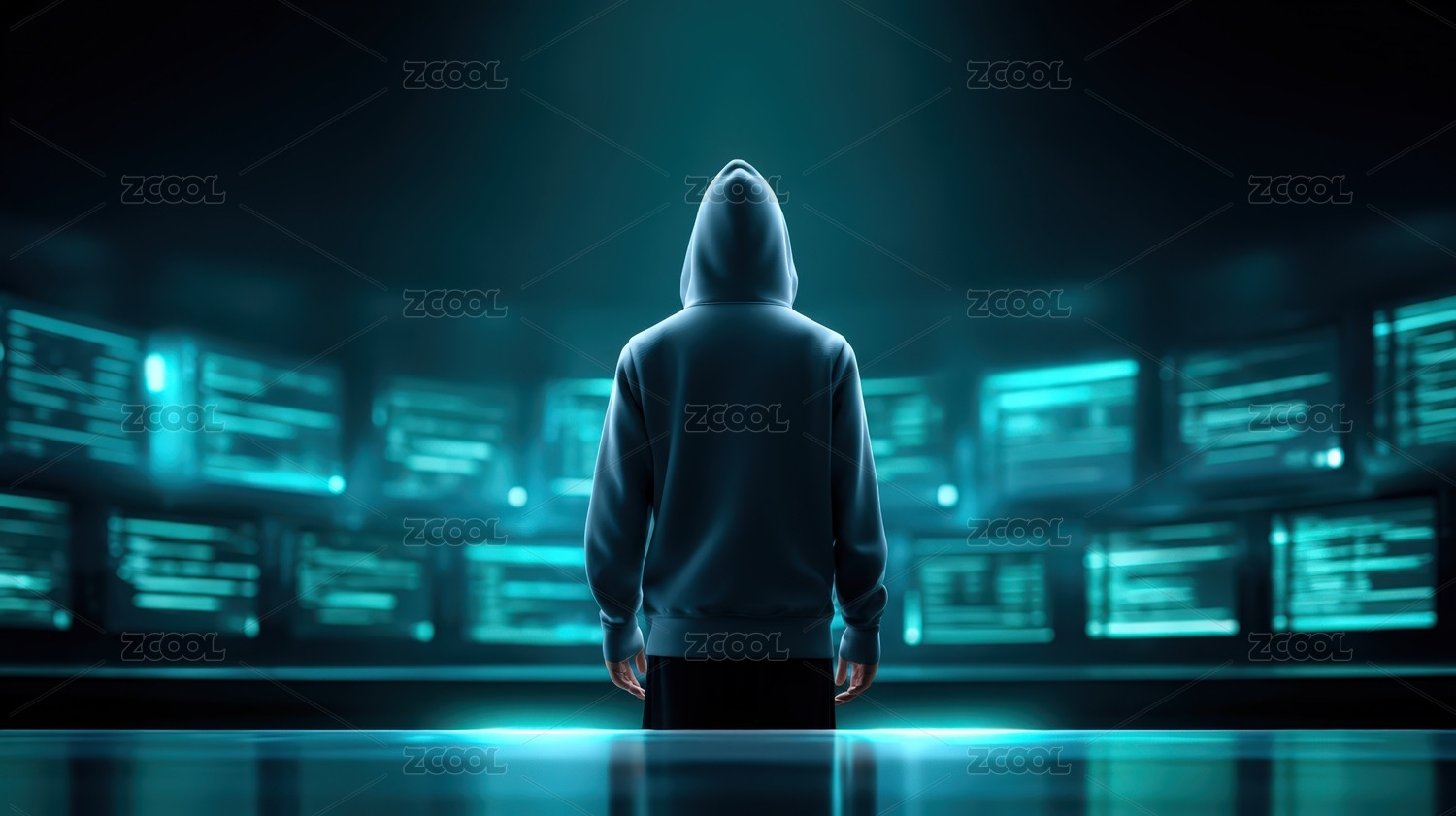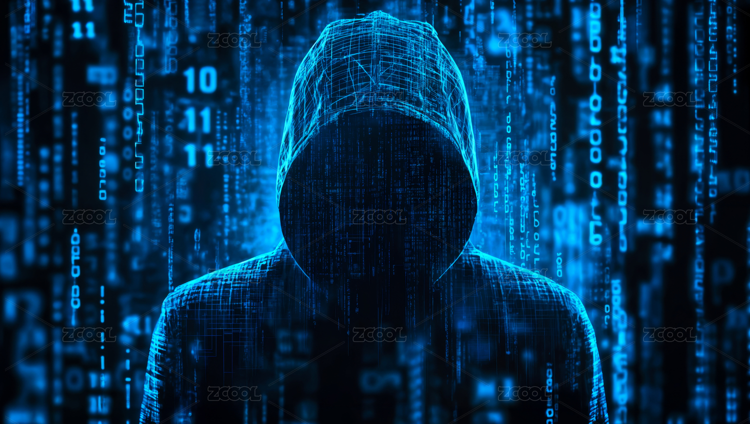 黑客背对镜头站在数字化科技感背景前