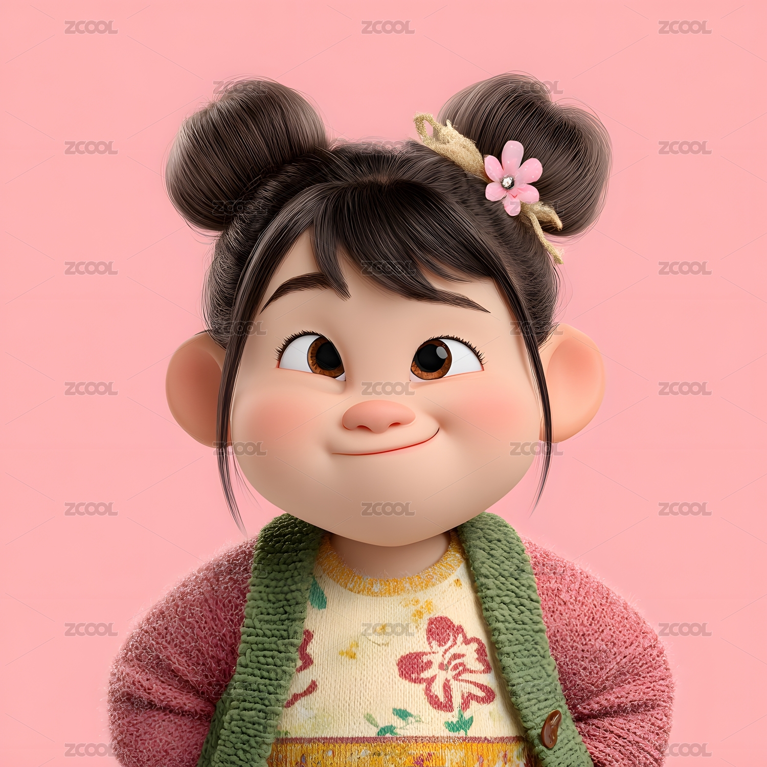 双丸子头卡通黄衣萌娃祈福可爱女孩3D插画