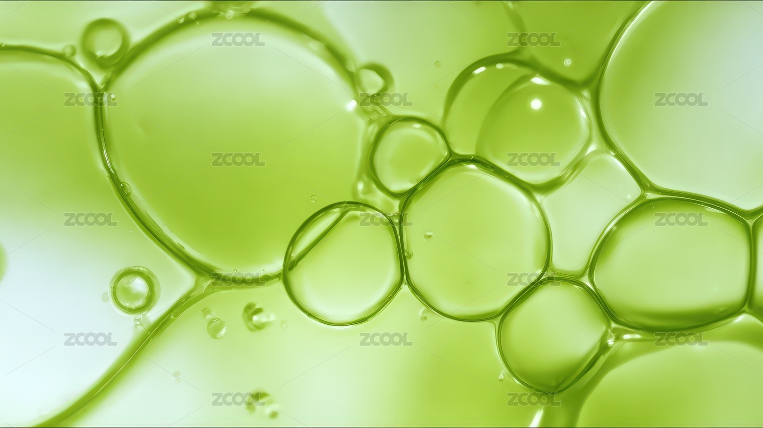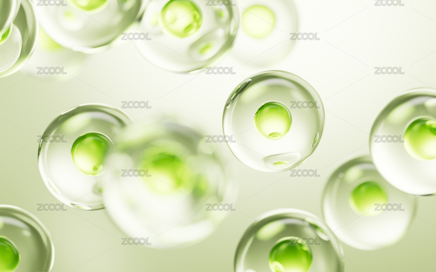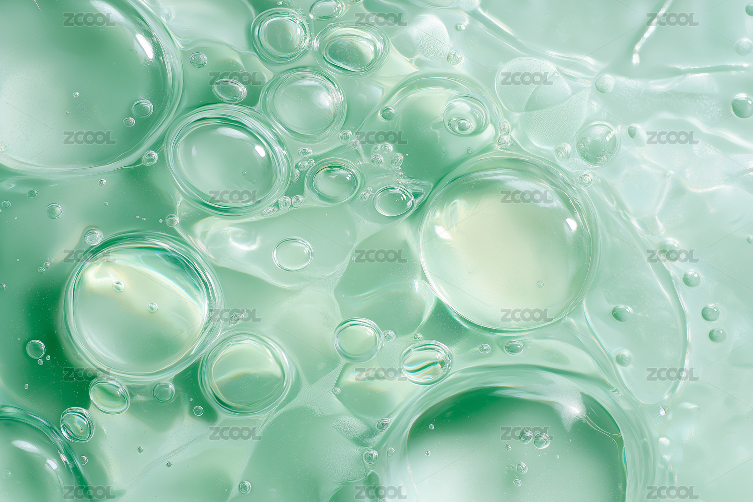 光滑水面绿色背景中的泡泡化妆品成分插图
