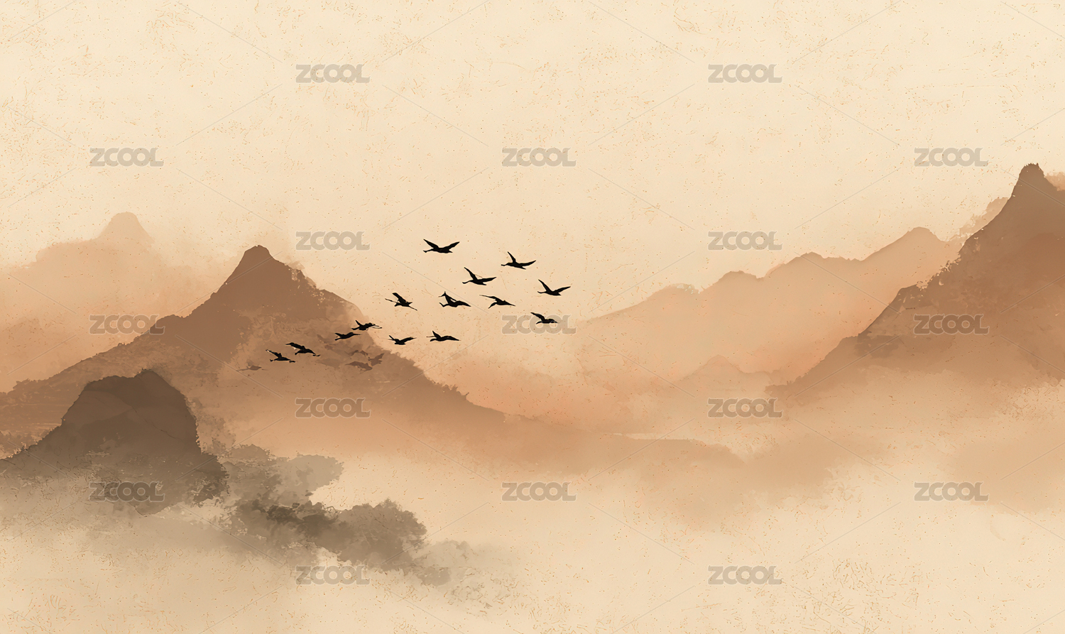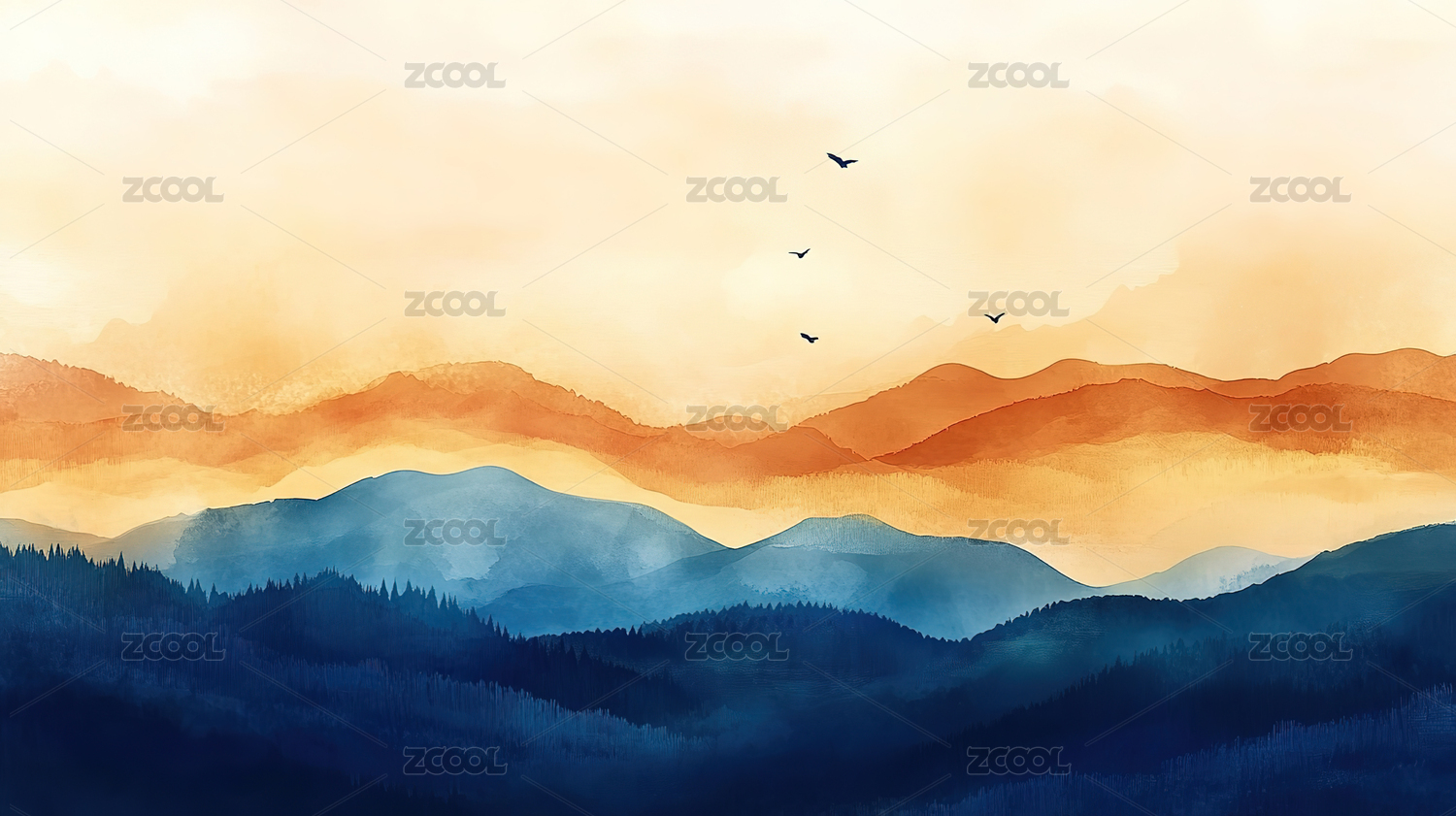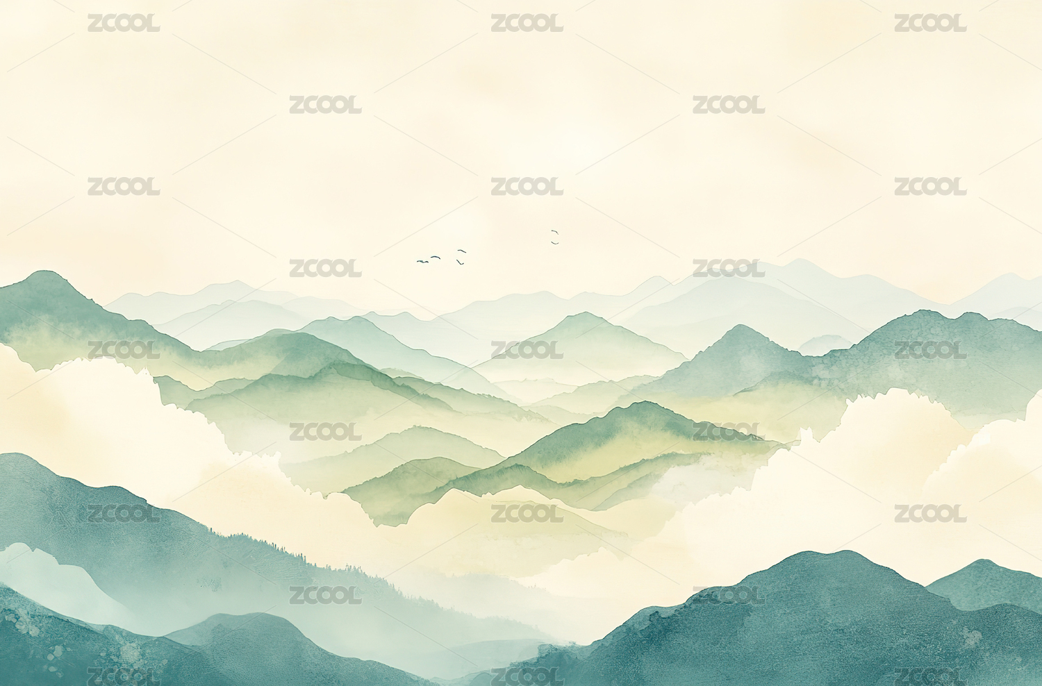 山水,山峦,云雾,飞鸟,远景,淡彩,水墨画,意境,朦胧