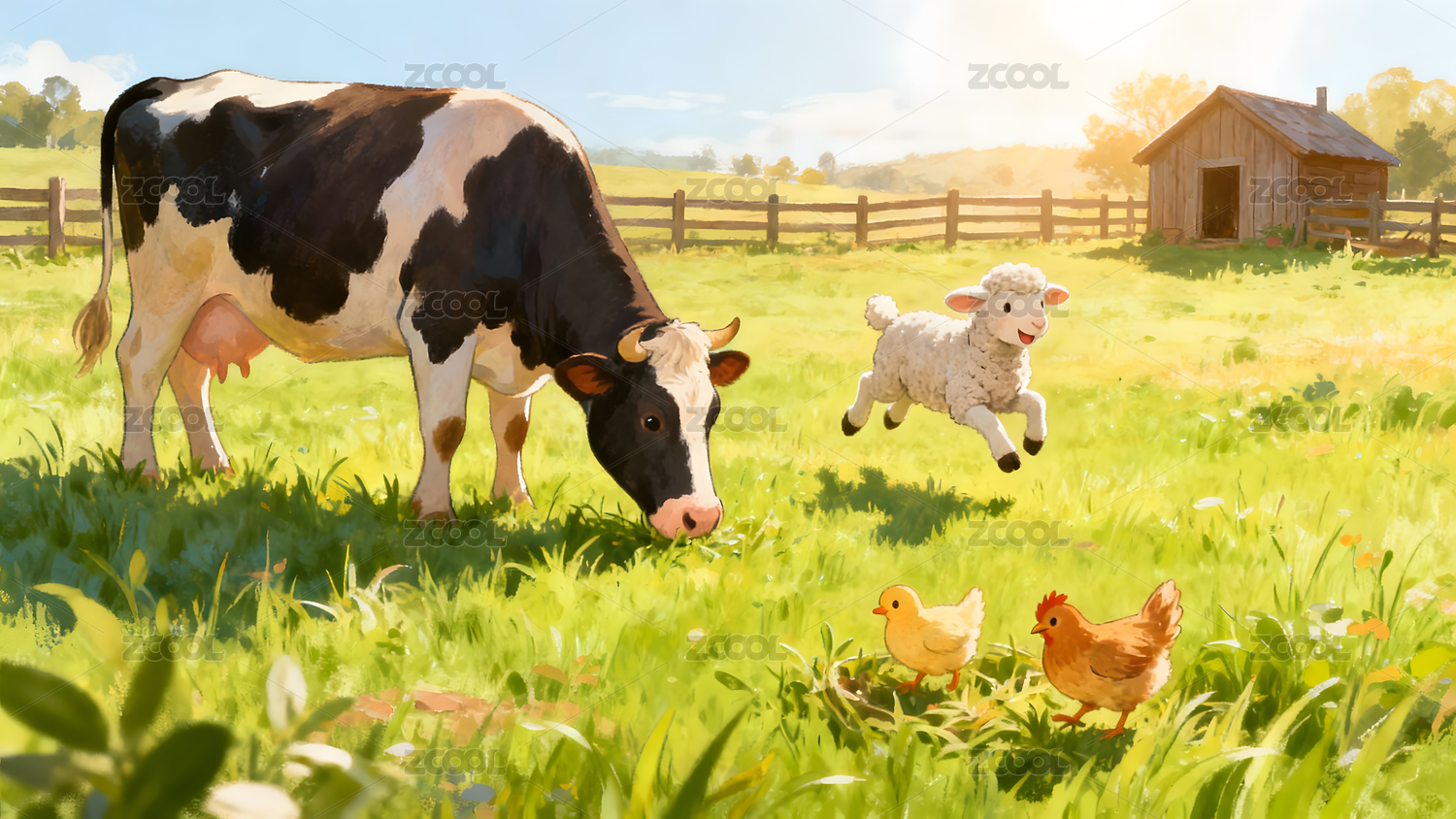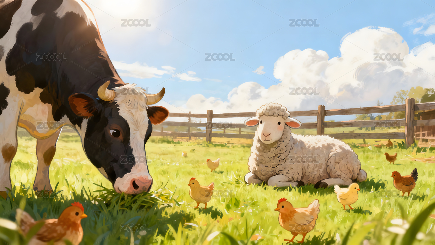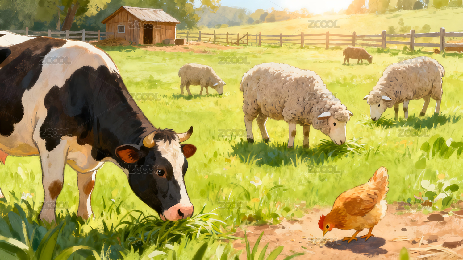 牧场,奶牛,羊,小鸡,家禽,家畜,草场,田园,动物,卡通