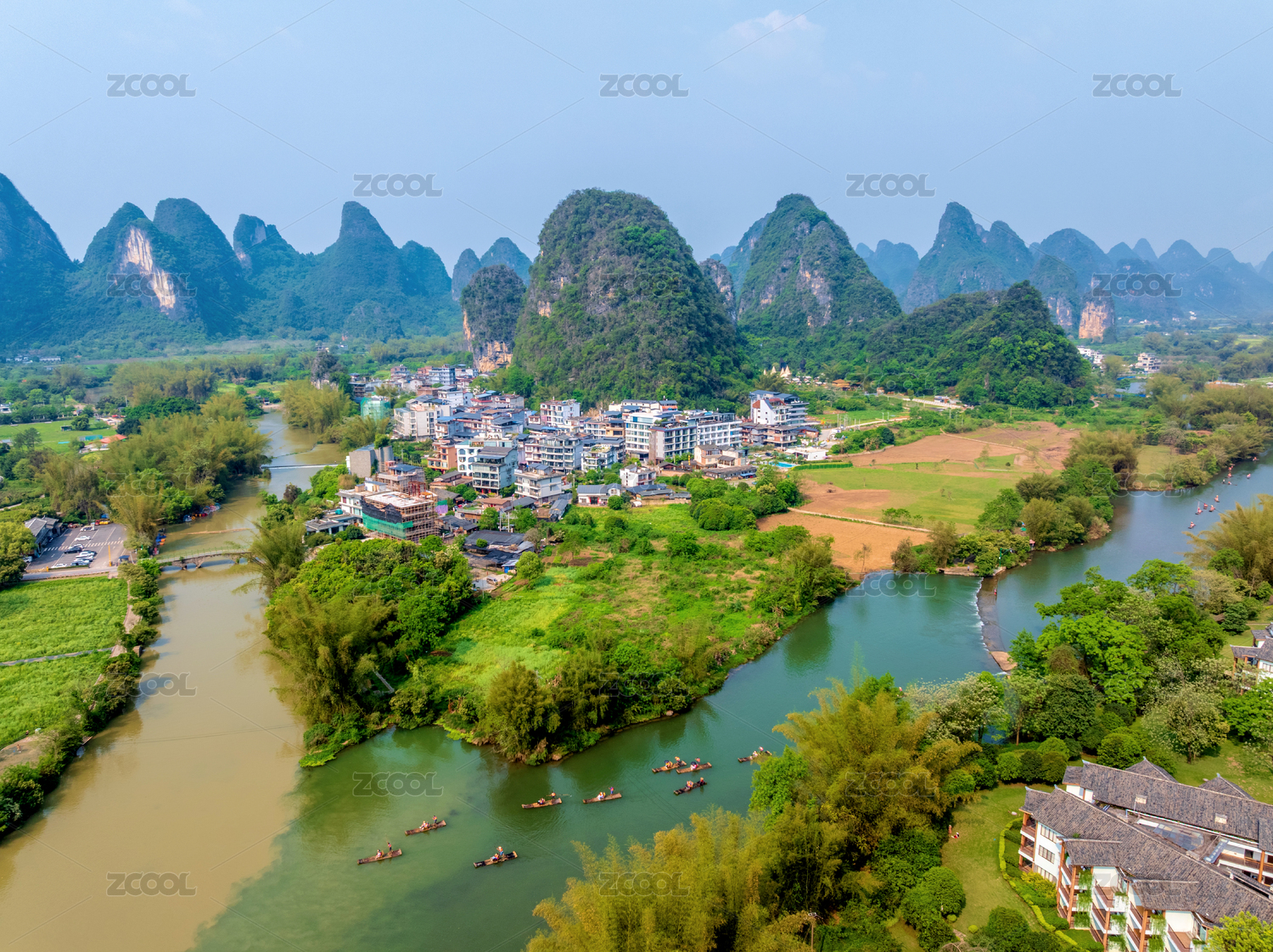中国广西桂林阳朔遇龙河漂流航拍风光