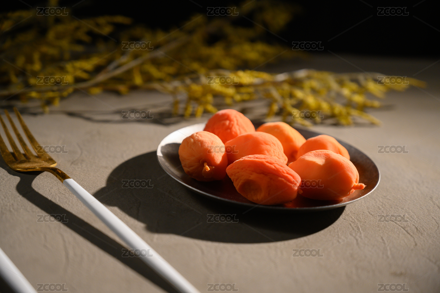 桌面上的盘子里的美味可口的糖金桔