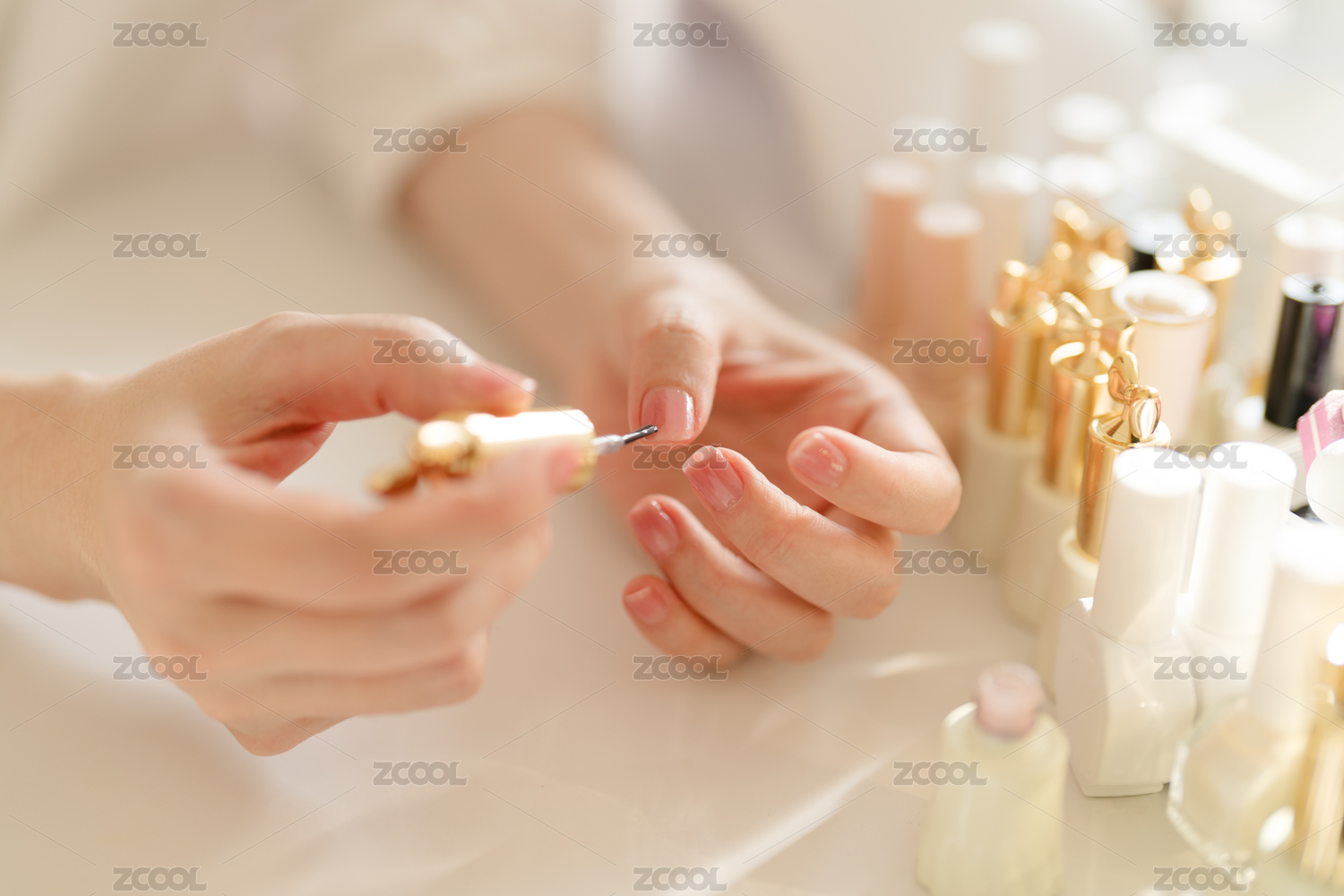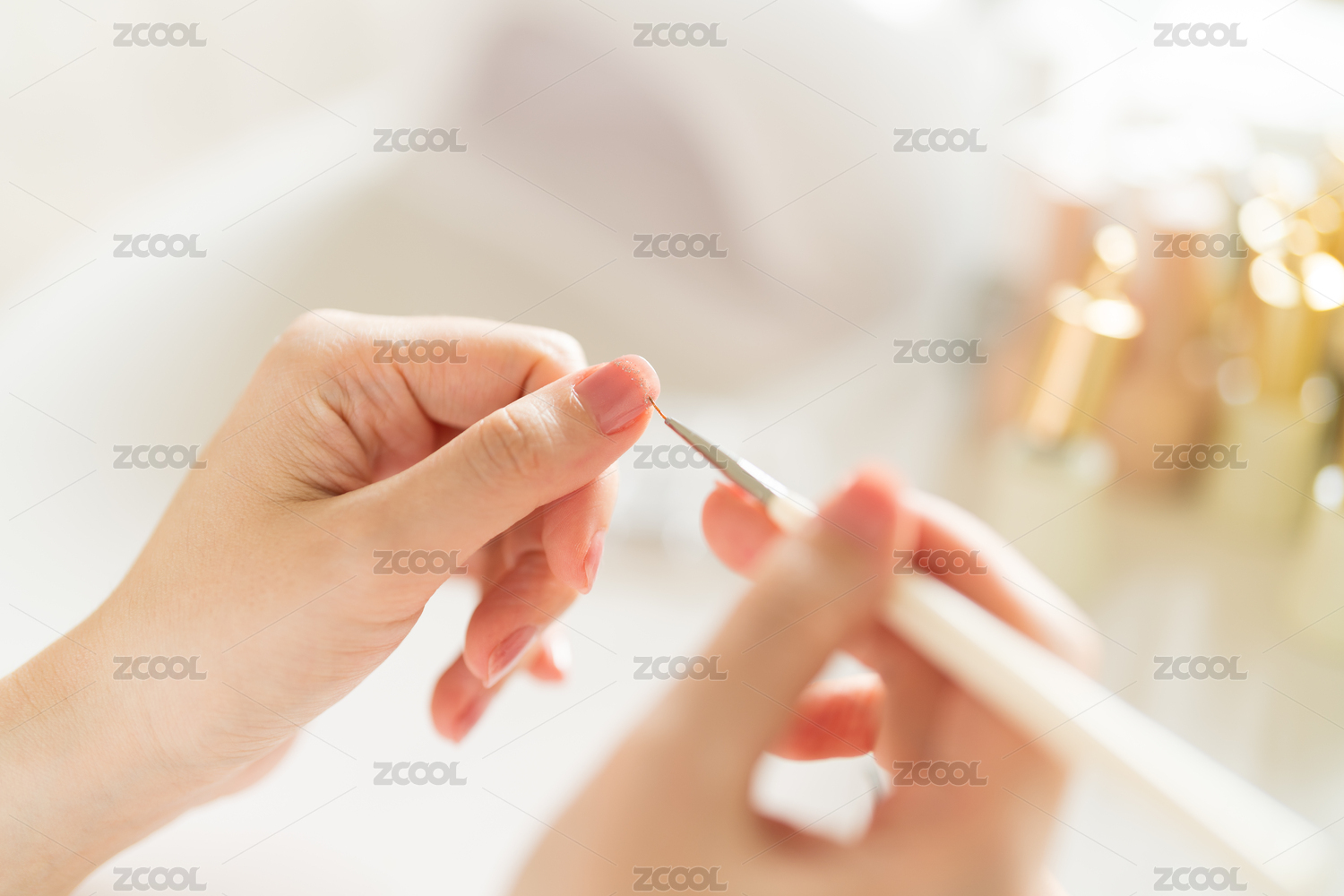 女人手拿彩绘笔把碎钻甲油胶画在指甲上