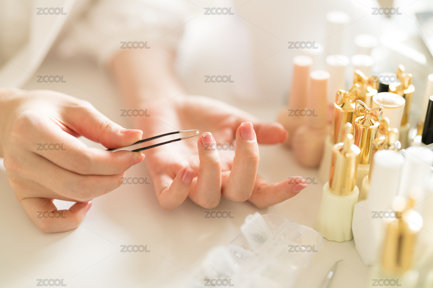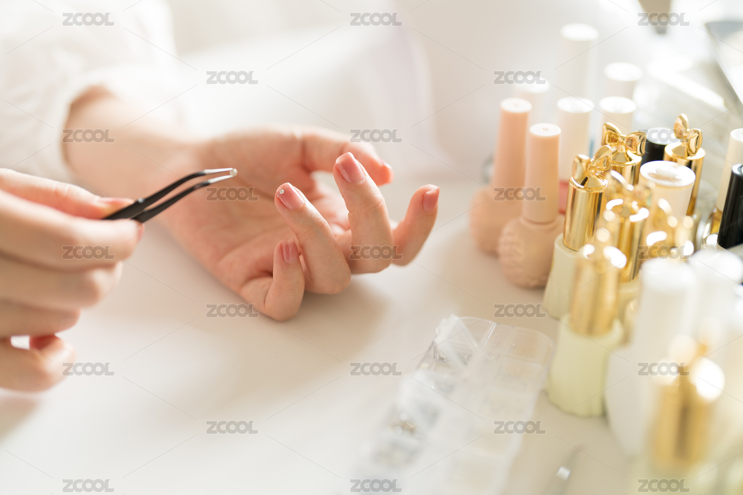 女人手拿钳子取盒子里的小钻准备贴在指甲上