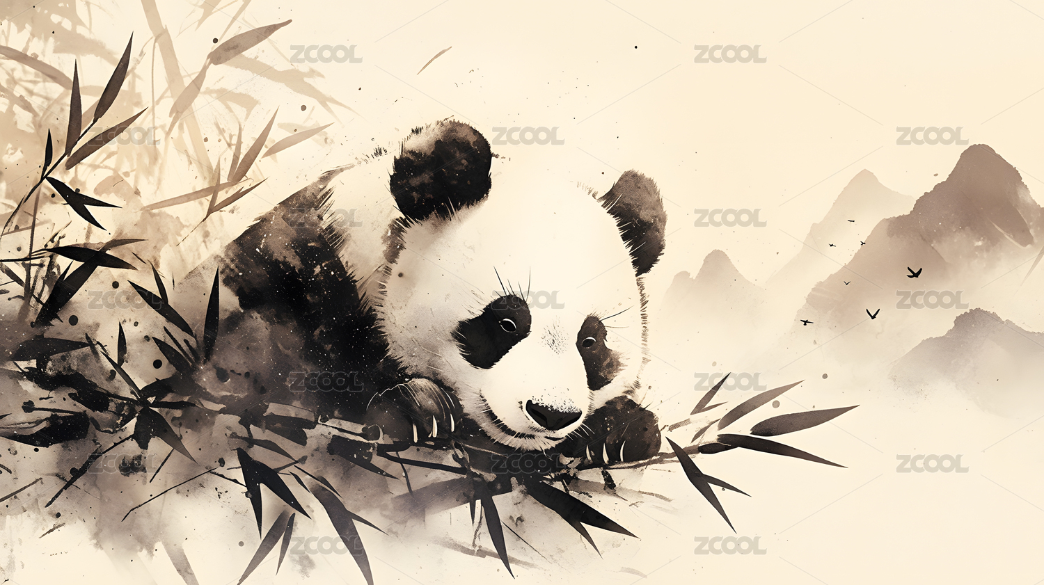 水墨风格熊猫栖息竹林山峦