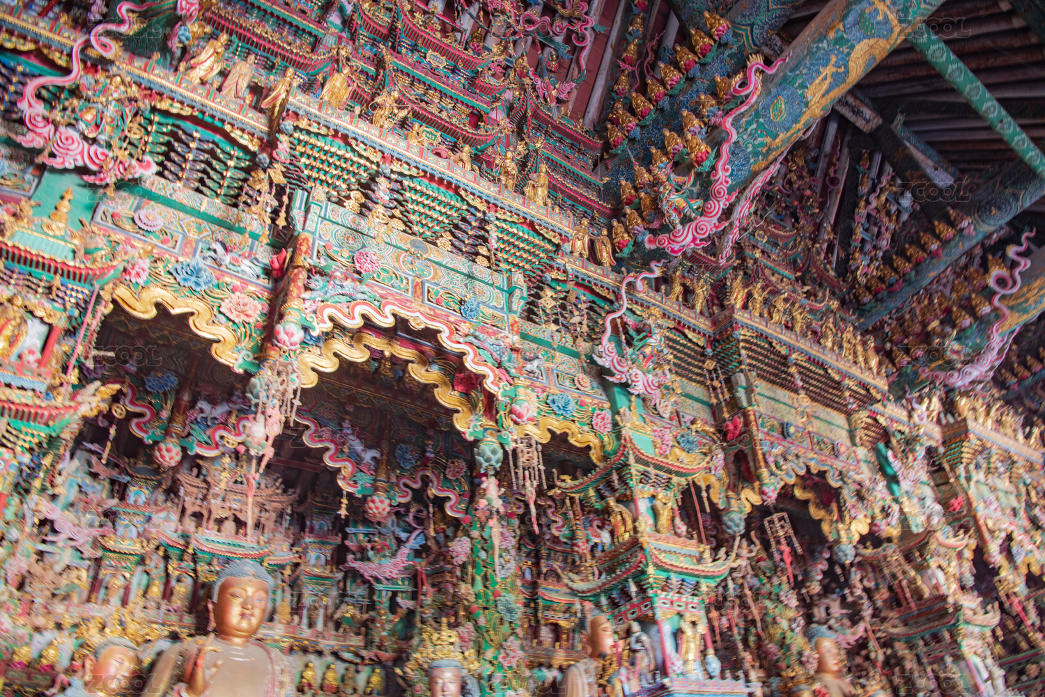 山西临汾隰县小西天内的明清贴金悬塑及彩绘