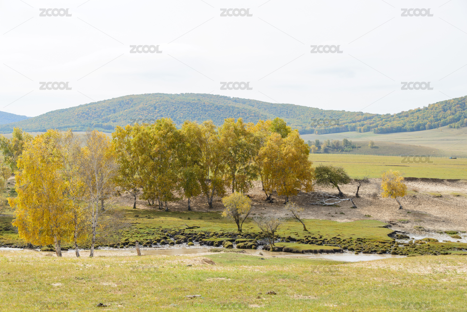 秋天内蒙古乌兰布统坝上草原的沙地和白桦林
