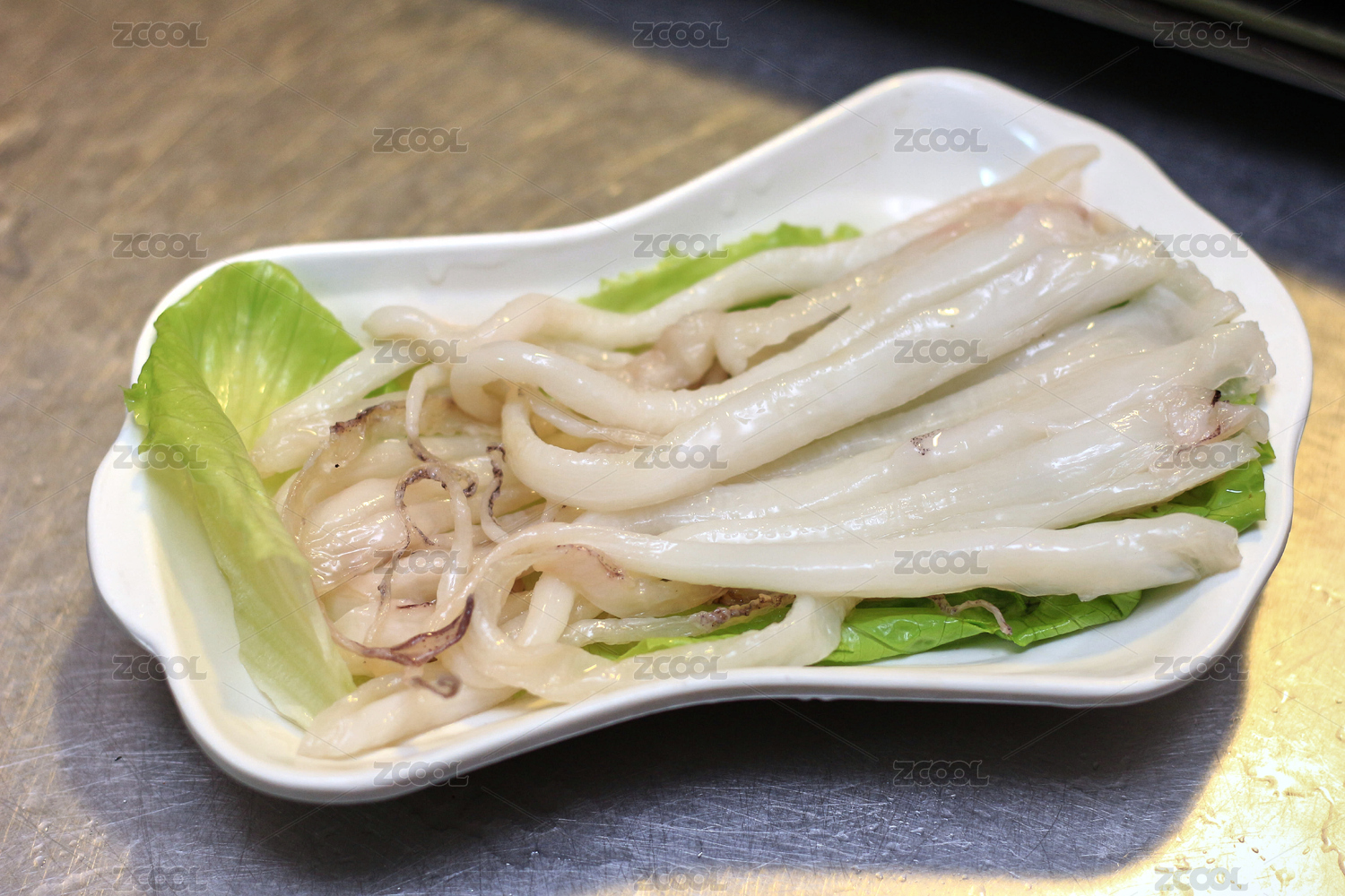 美味营养的火锅菜鱿鱼须整齐的放在白瓷碗中