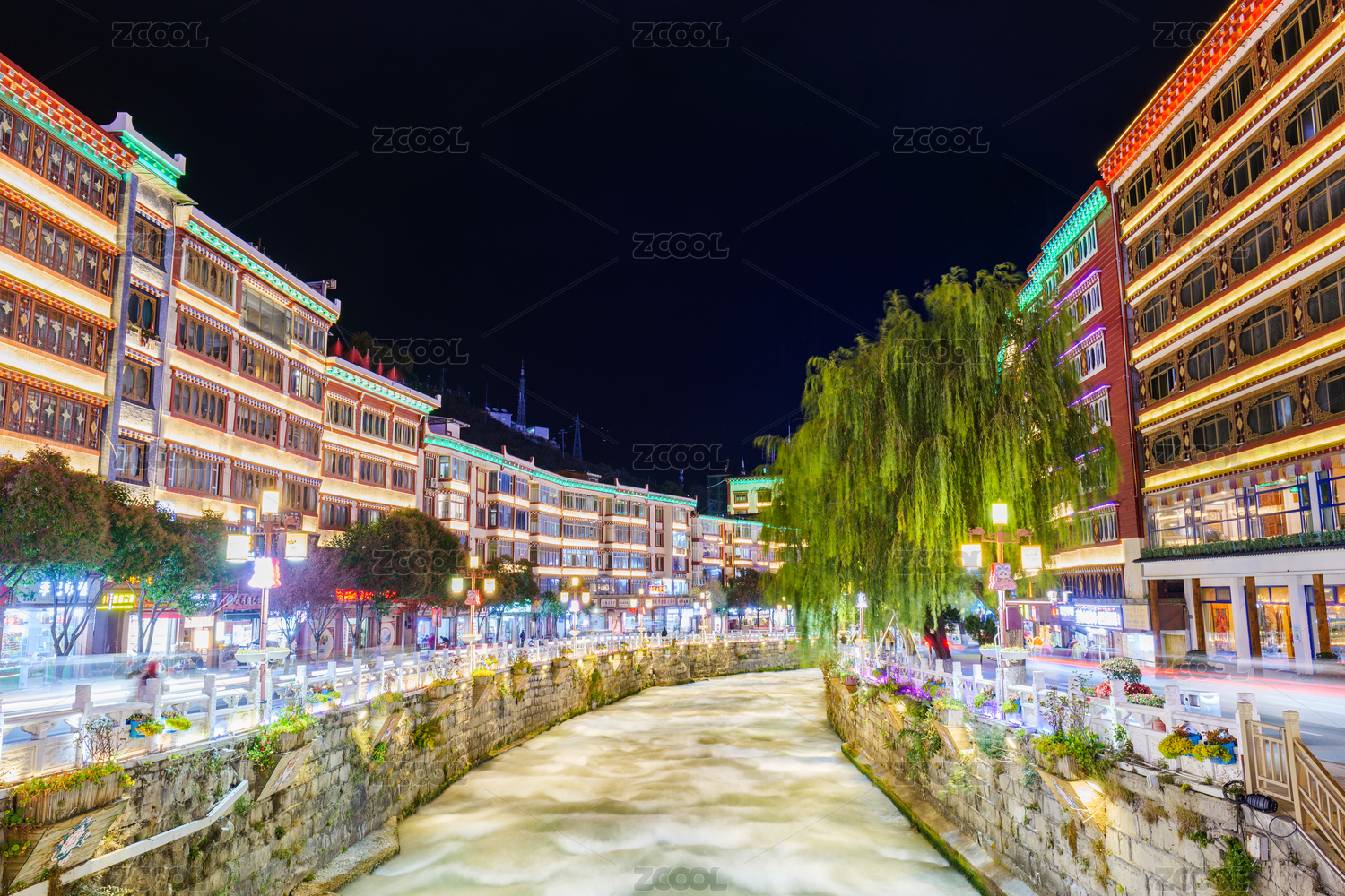 中国湖南湘西凤凰古城沱江两岸漂亮的夜景风光