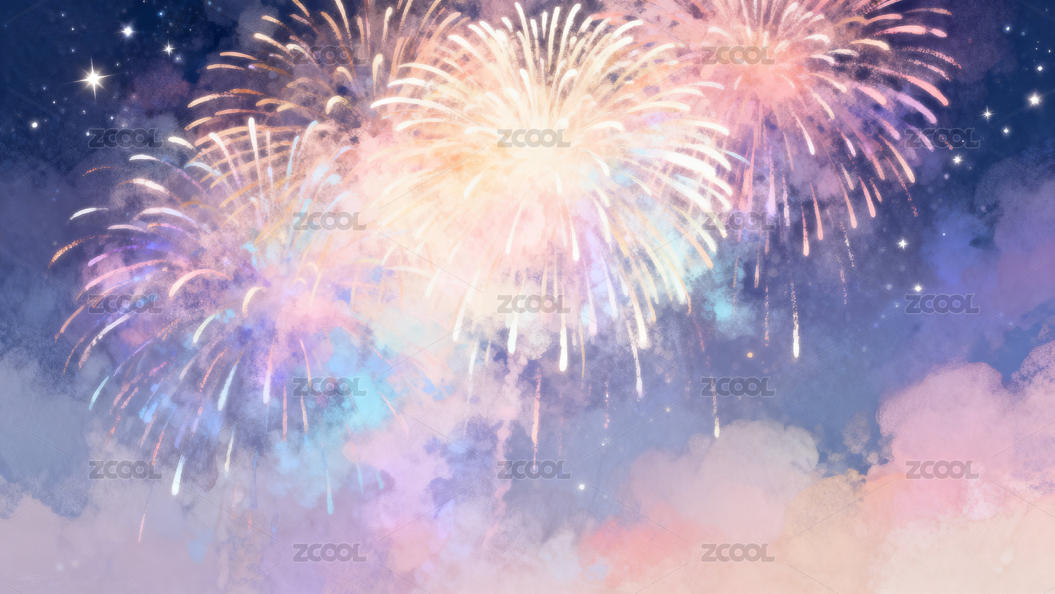 夜空中绽放绚丽的烟花-唯美梦幻节日插画