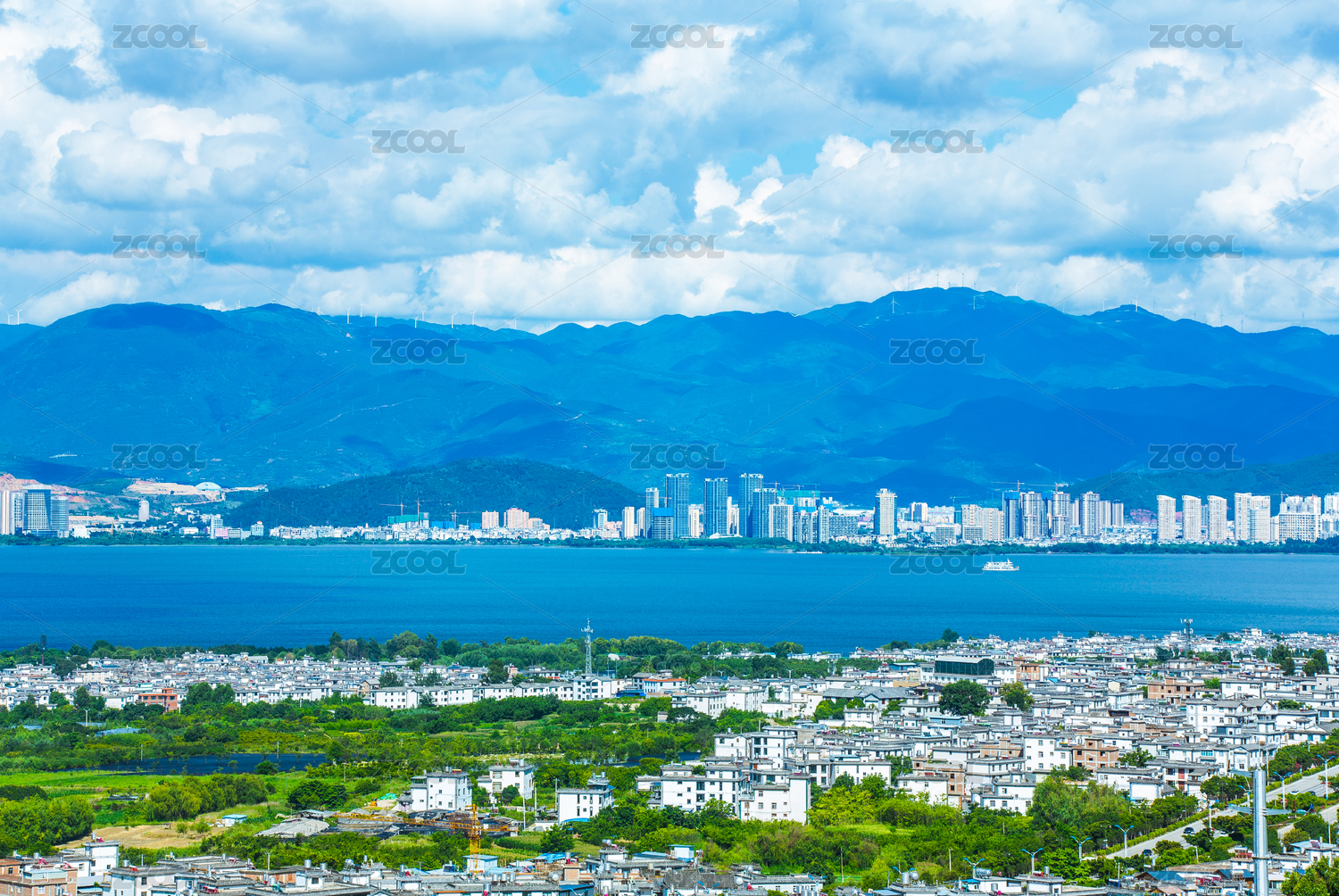 中国云南省大理市俯瞰洱海外滩城区高楼建筑