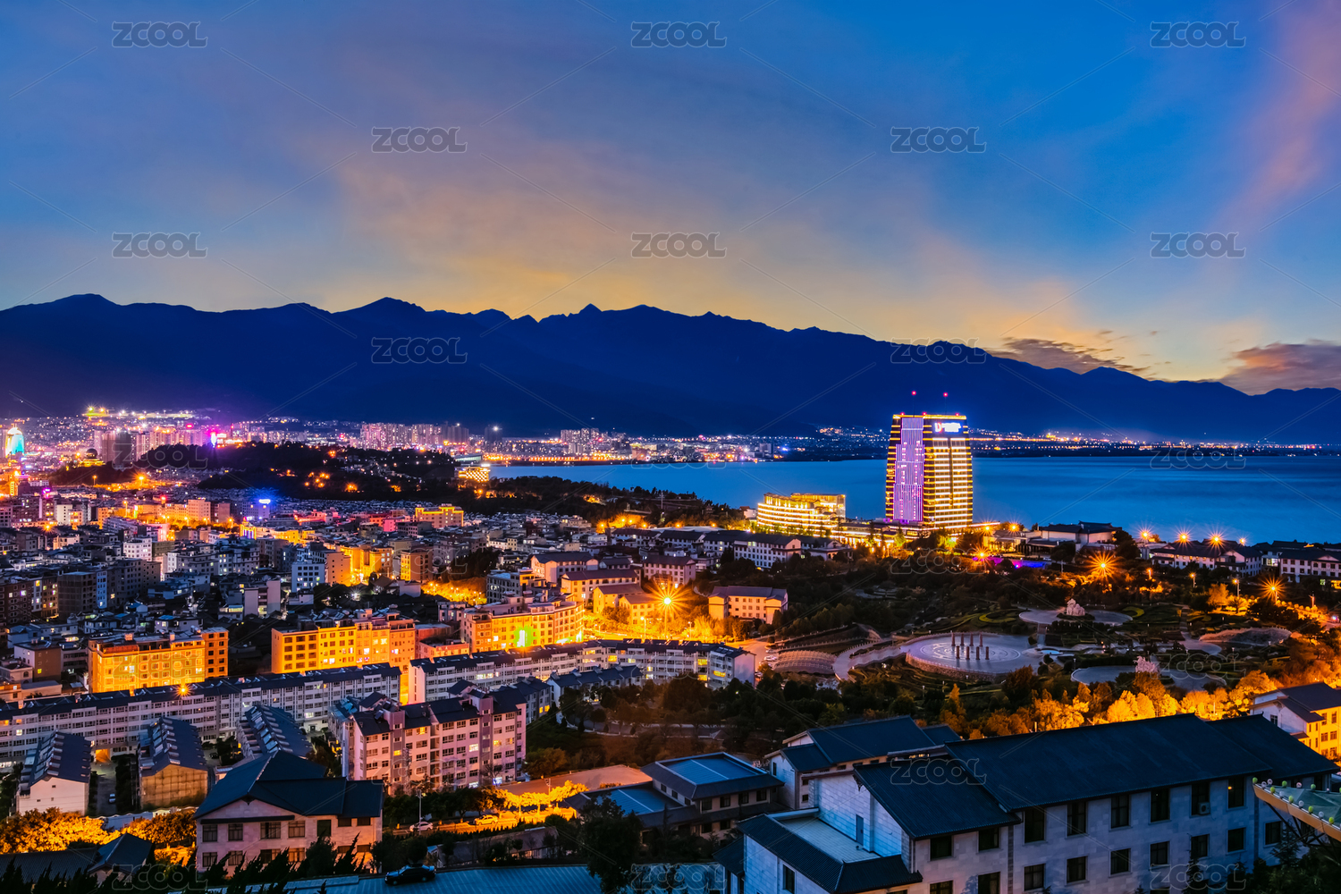 中国云南省大理市夜晚灯光洱海外滩高楼建筑