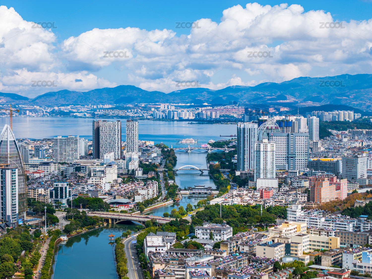 云南大理下关市区苍山洱海蓝天白云航拍