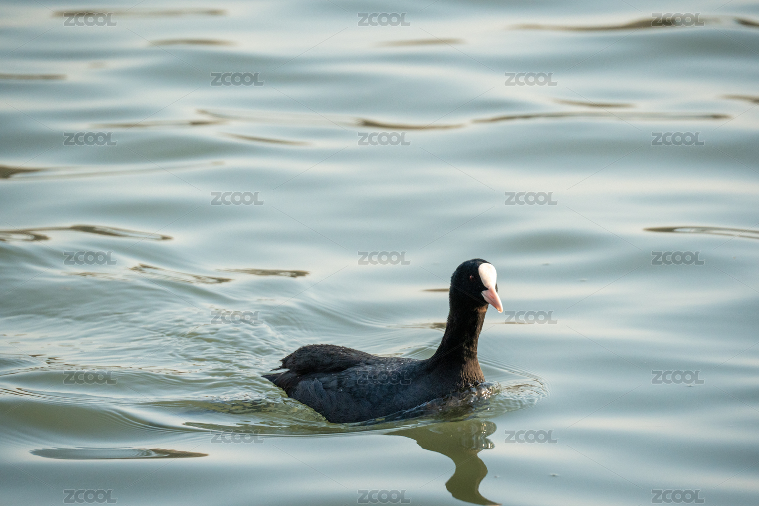 水鸟,白骨顶鸡,游禽,水面,水波,羽毛,黑色,白喙,红眼睛,水域