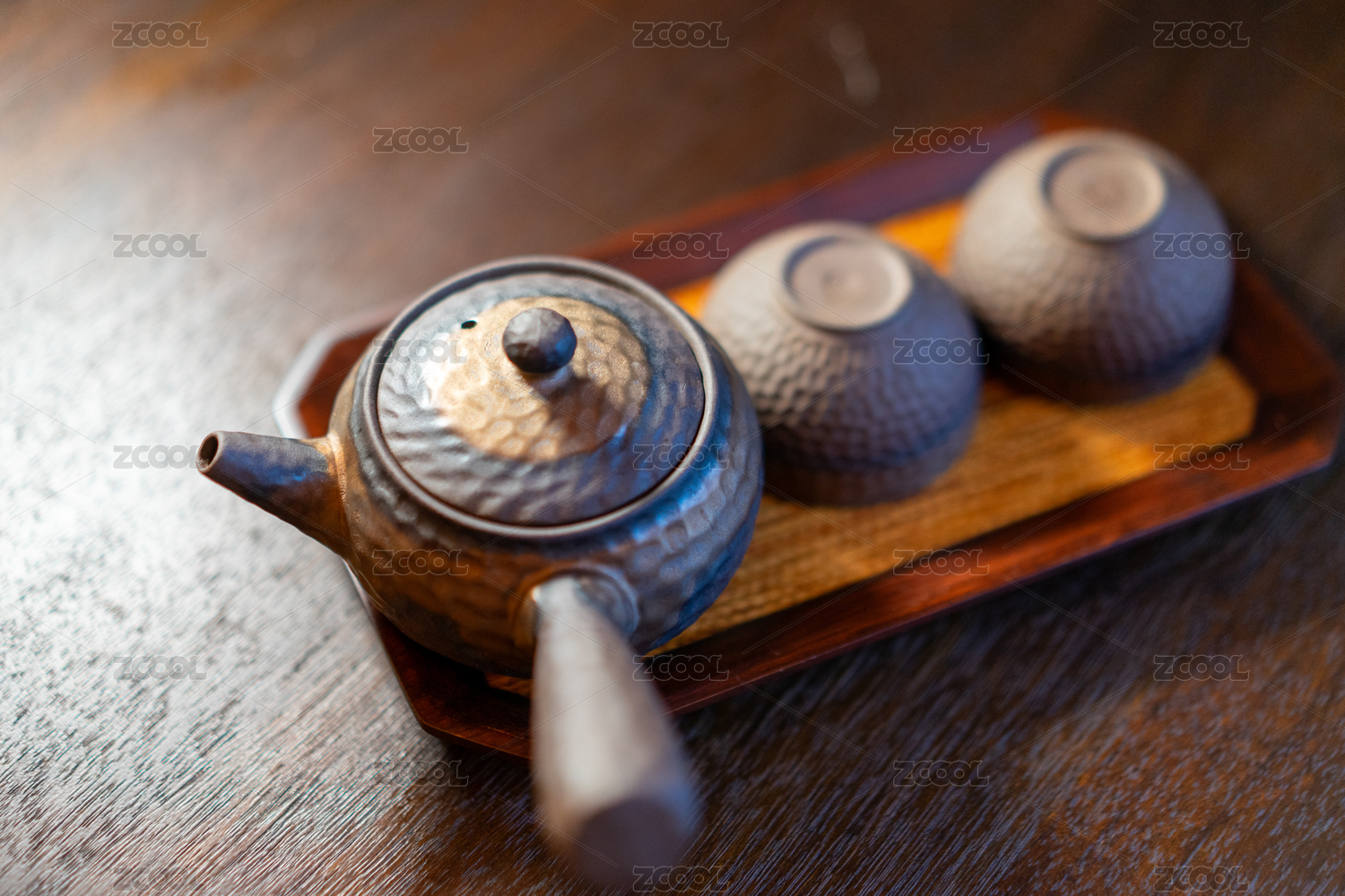 桌面上摆放的带有藤编保护套的瓷器茶具