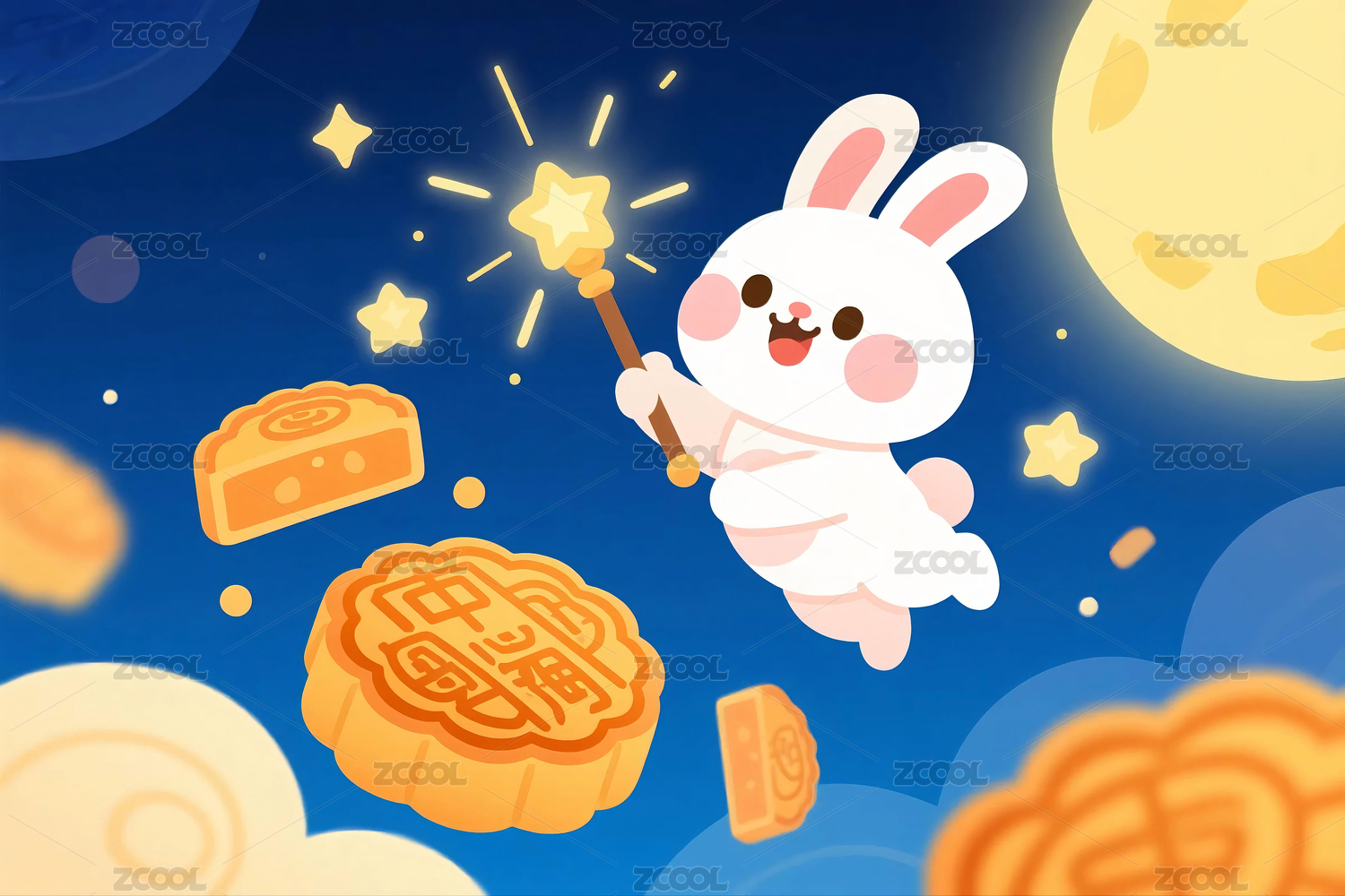 中秋节海报插画玉兔使用魔法棒变出月饼庆祝