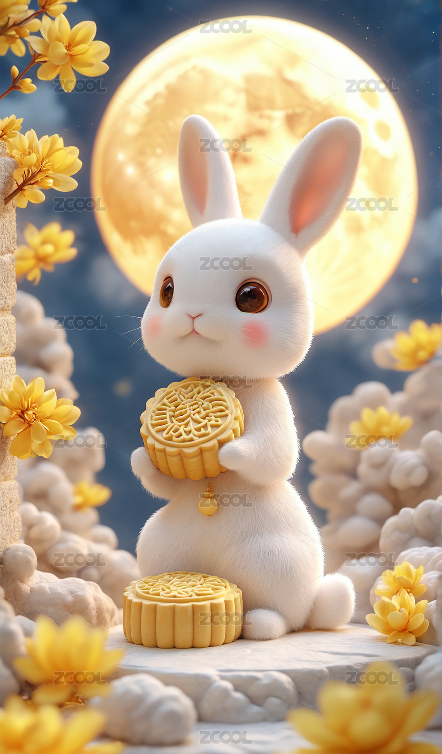 月下玉兔捧茶杯坐于月饼之上