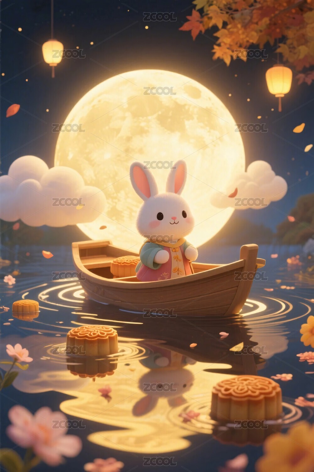 玉兔泛舟于中秋月夜之景