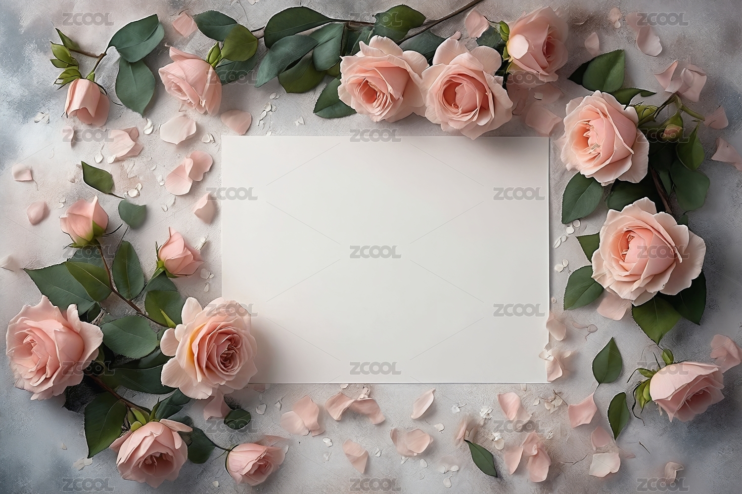 粉色玫瑰环绕的空白米色卡片