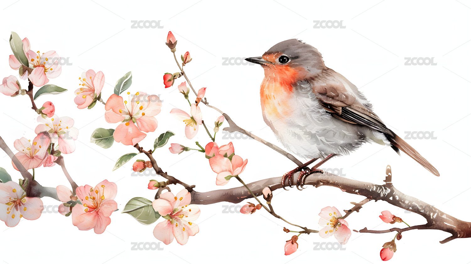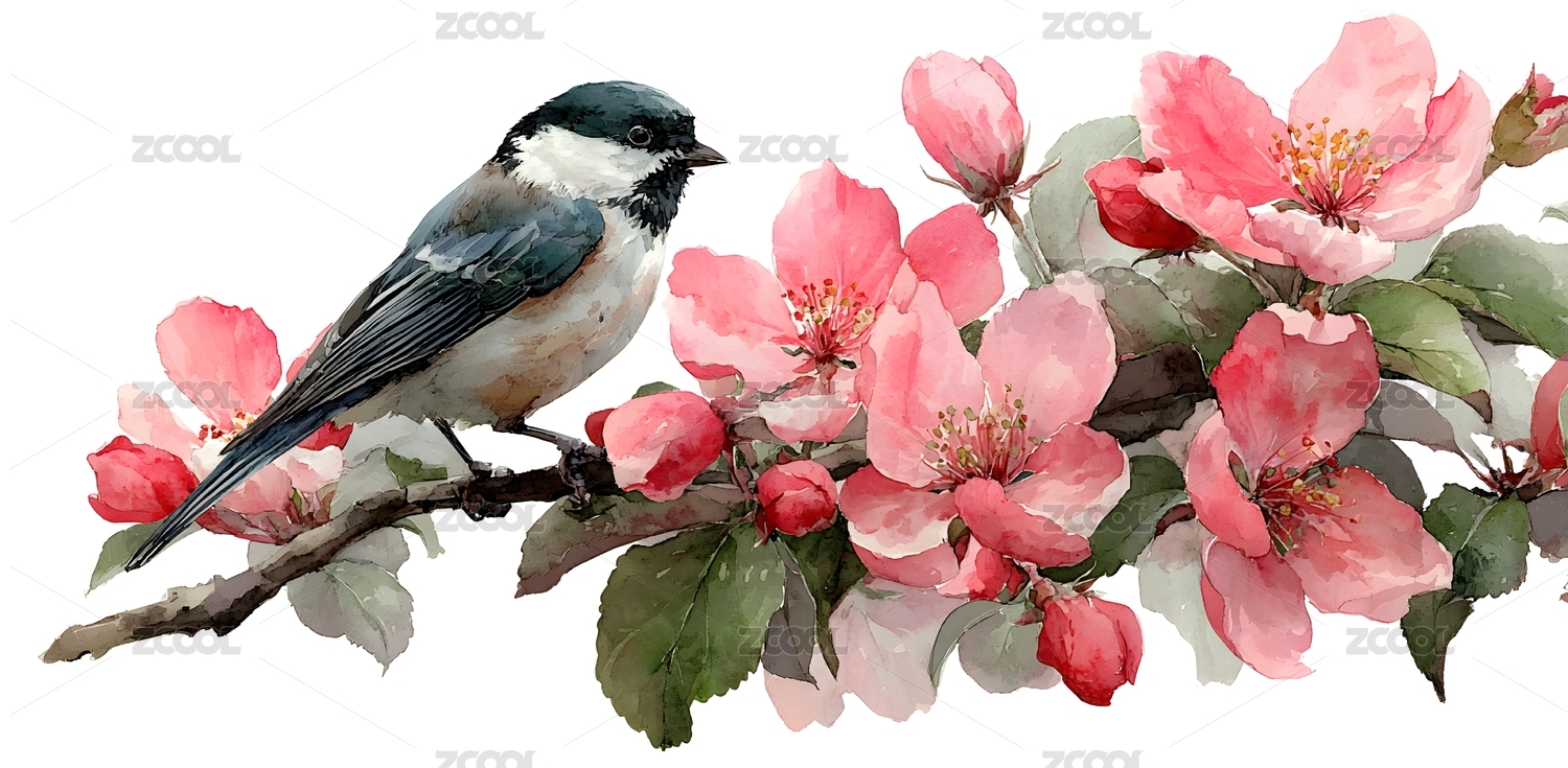 鸟儿栖息粉色花枝 春意盎然