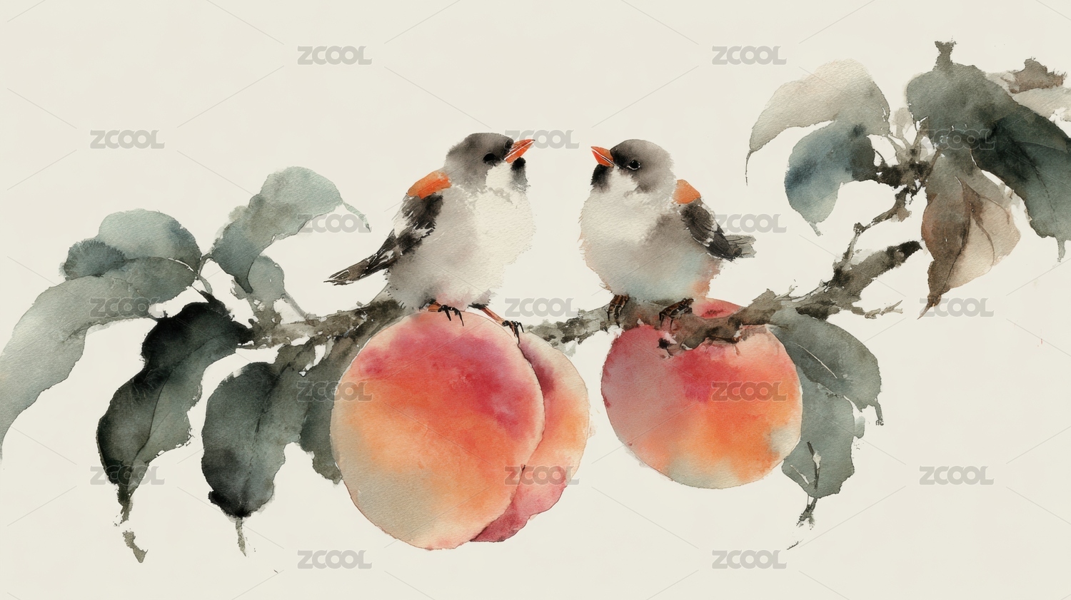枝头桃果与小鸟